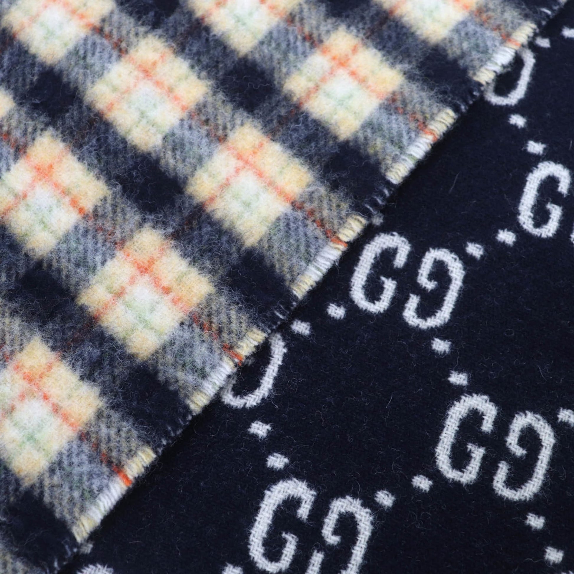 Gucci 597527 100% Wool Check And Gg Pattern Reversible Scarf With Fringe