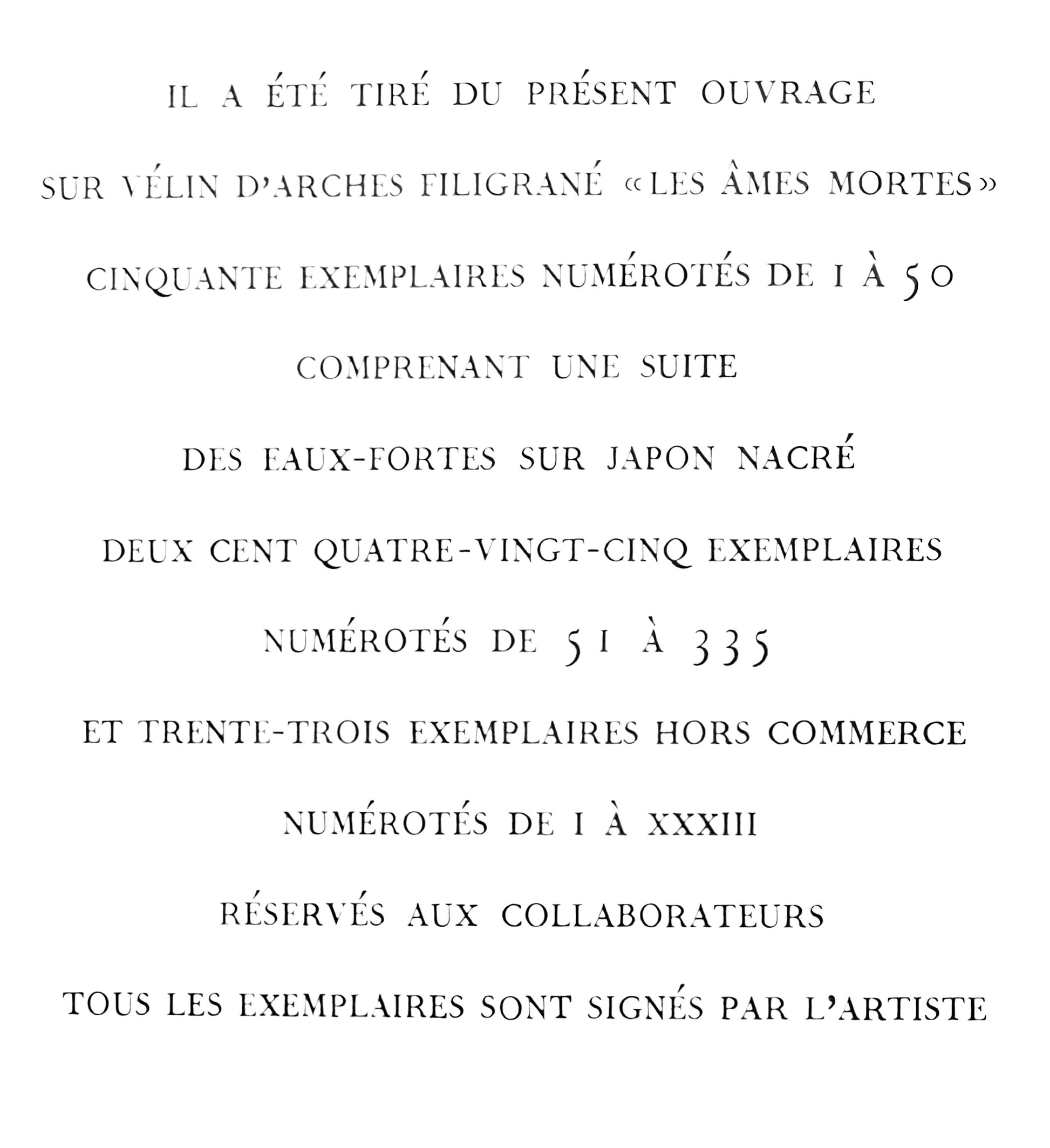 Excerpted from the folio (translated from French), It was taken from this album, on velin d arches filigrane "Les Ames mortes", L examples, numbered from there, including a complimentary suite on japon nacre; CCLXXXV examples, numbered from LI to CCCXXXV and XXXIII non-market examples, numbered from I to XXXIII reserved for employees. All colophons are signed by the artist.