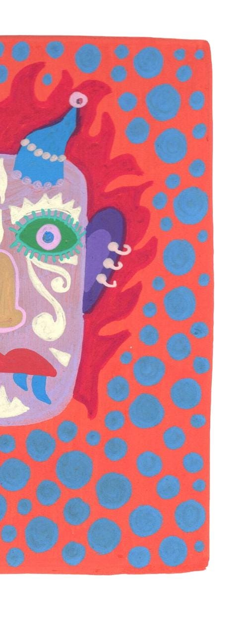 Inspired by the South Indian Drishti Bommai mask; a protective talisman traditionally represented as a doll; this artwork draws from a visual language widely seen across South India.