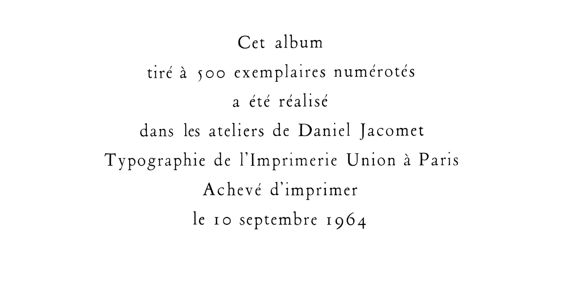 Excerpted from the folio (translated from French), This album, drawn in L numbered examples, was shot in the workshops of Daniel Jacomet; typography of the Union Printing in Paris. Completed printing on September 10, 1964.