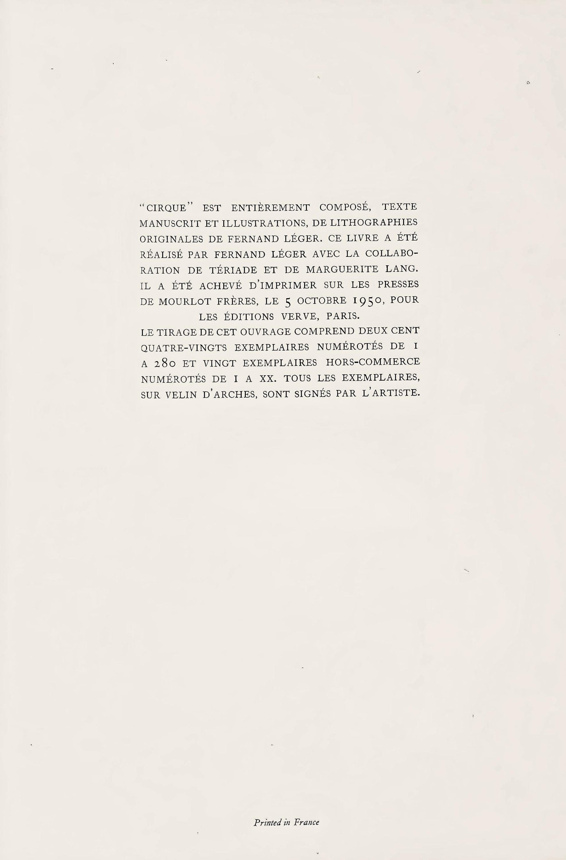 Excerpted from the folio (translated from French), "Cirque" is entirely composed, handwritten text and illustrations, of original lithographs by Fernand Lger.