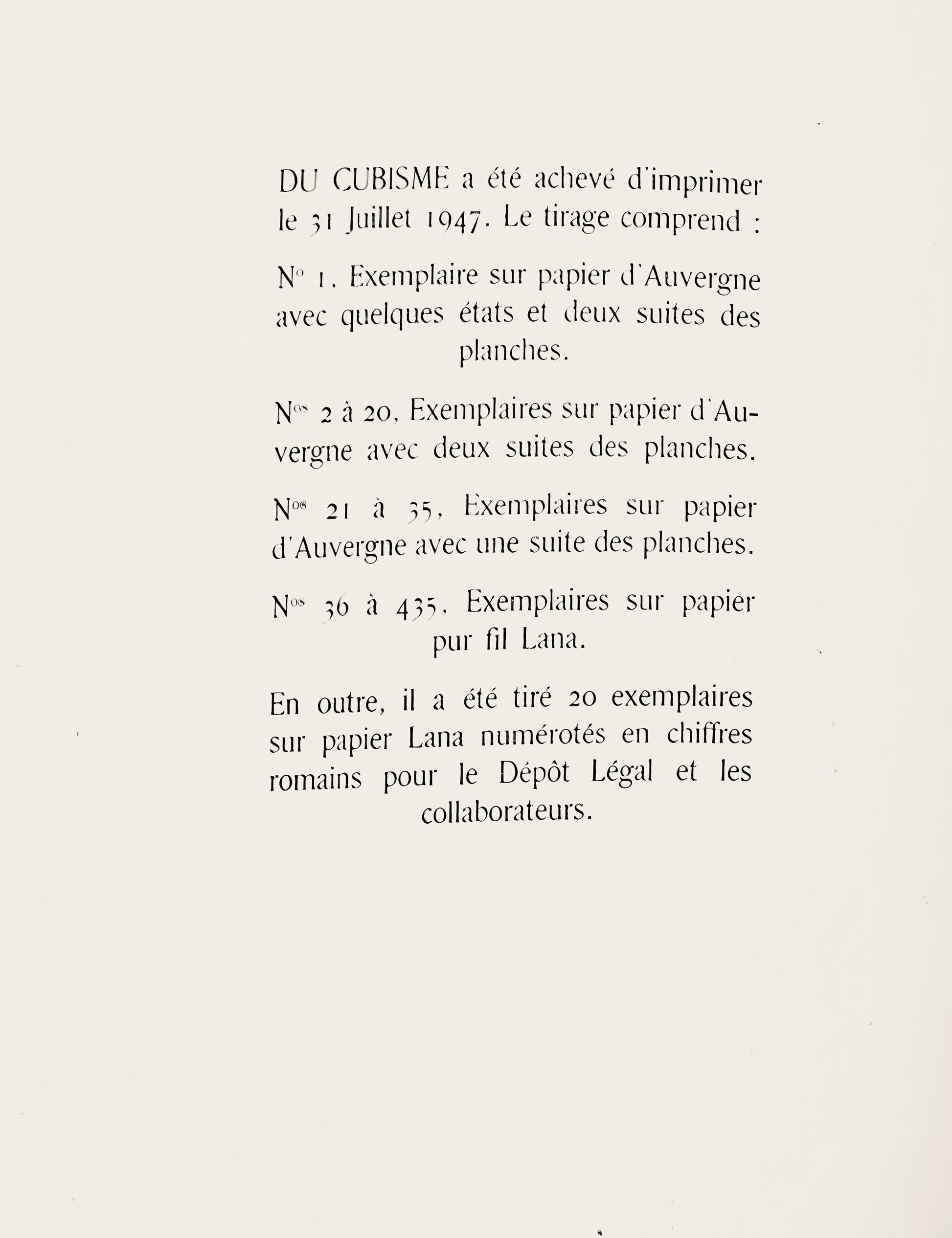 Excerpted from the album (translated from French), Du cubisme...was completed to print on July 3, 1947 by R.