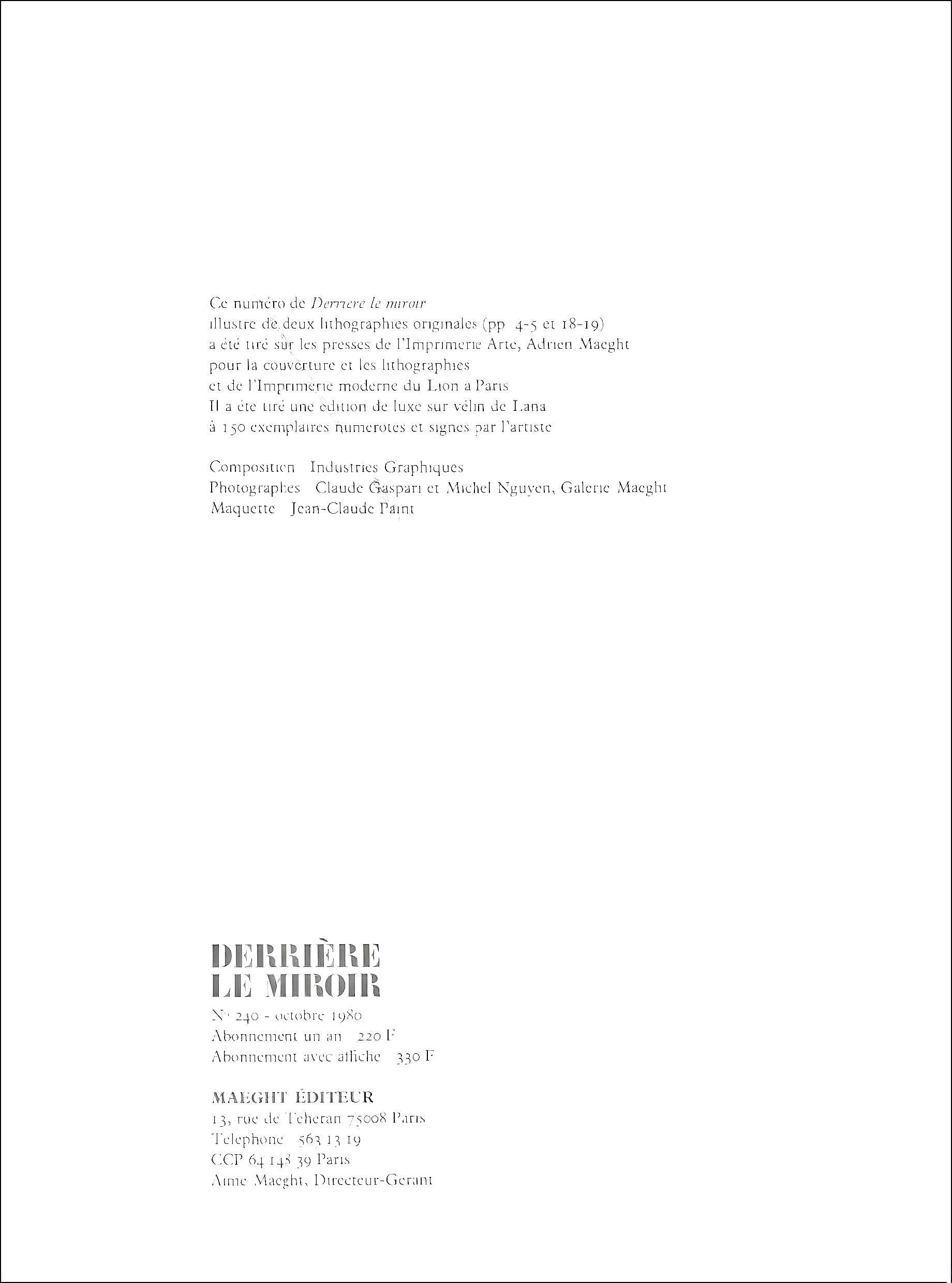 Published by Aim Maeght, diteur, Paris; printed by ditions Pierre Feu, Galerie Maeght, Paris.