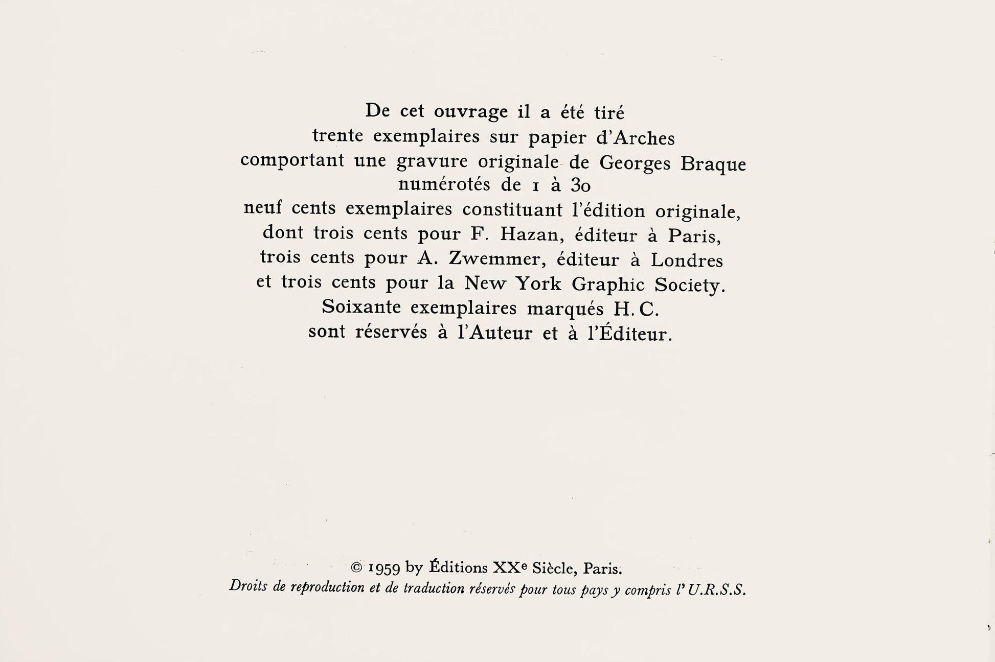 Excerpted from the album (translated from French), XXX examples of this work were printed on Arches paper, containing an original engraving by Georges Braque, numbered from I to XXX.