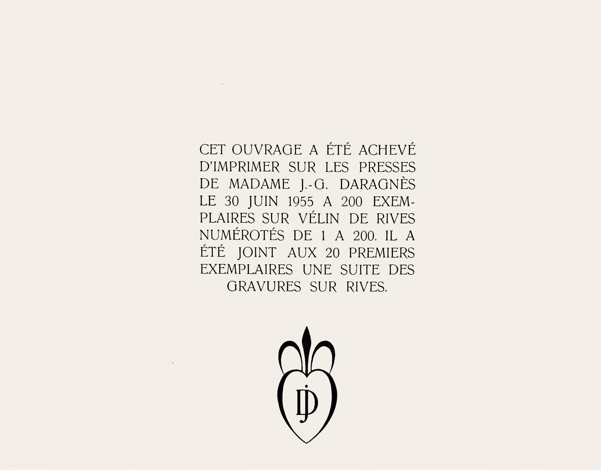 Published by Editions d'Art Manuel Bruker, Paris; printed by Imprimerie Daragns, Paris, June 30, 1955.