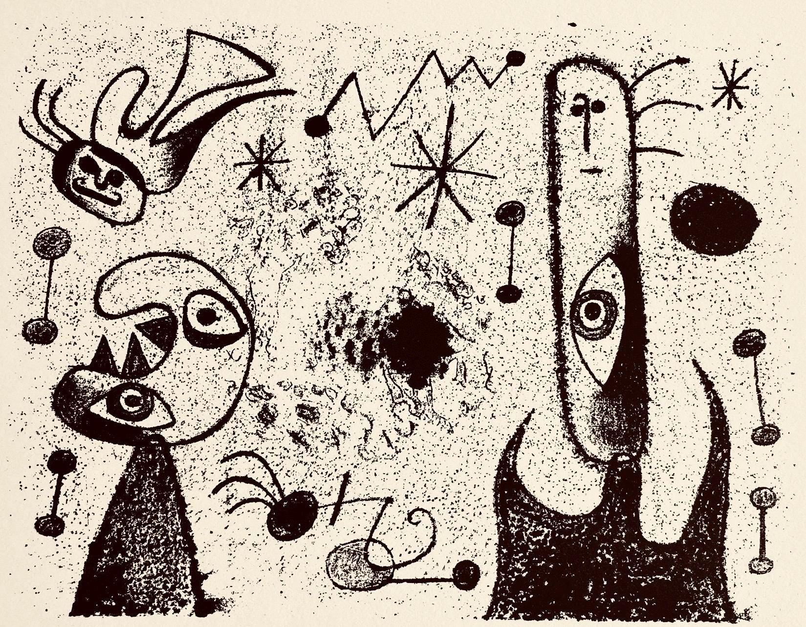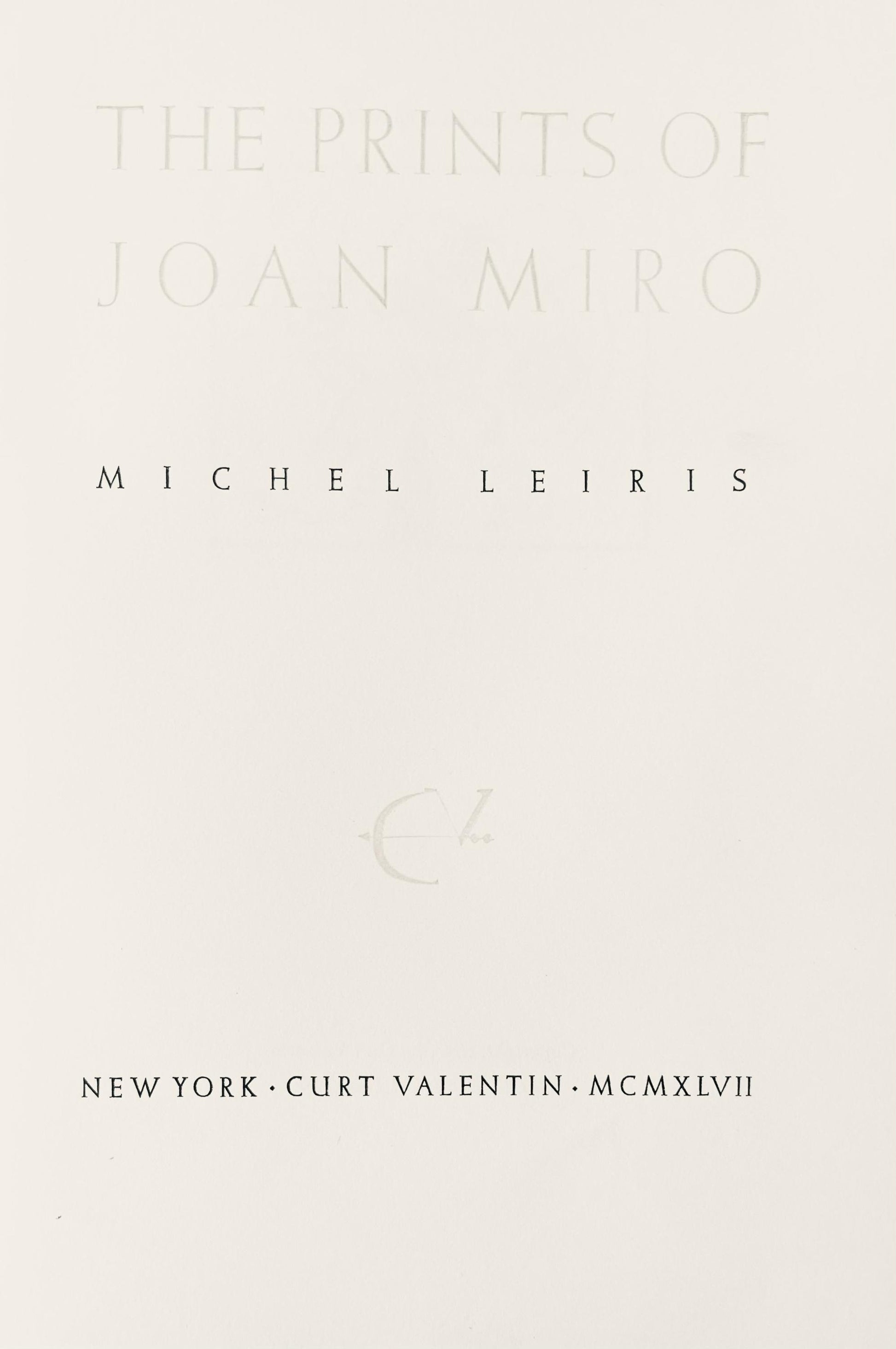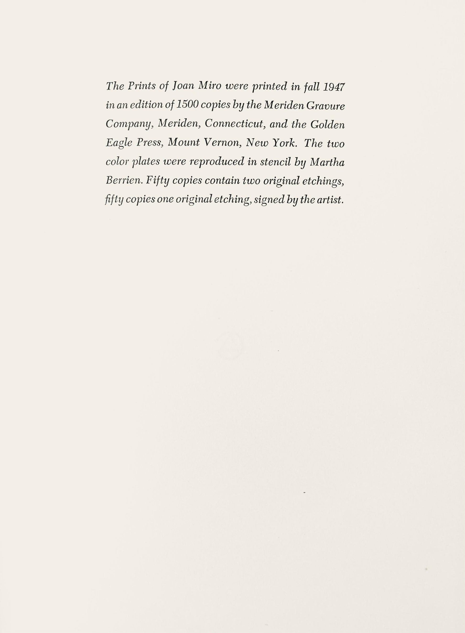 Excepted from the folio, The Prints of Joan Miro were printed in Fall 1947 in an edition of MD examples by the Meriden Gravure Company, Meriden, Connecticut, and the Golden Eagle Press, Mount Vernon, New York.