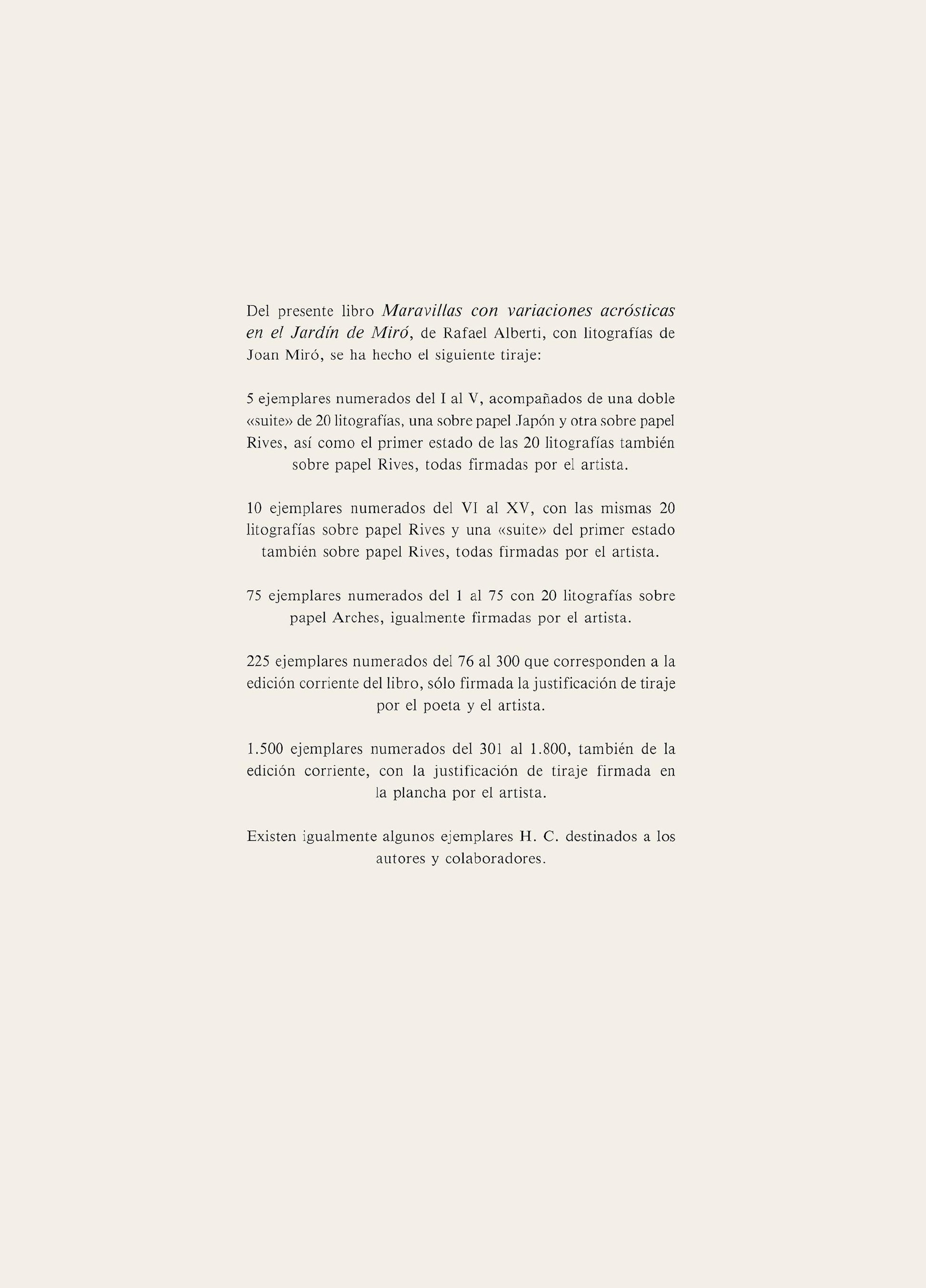 Excerpted from the folio (translated from French), From this album Maravillas con variaciones acrsticas en el Jardn de Mir, by Rafael Alberti, with lithographs by Joan Mir, the following edition has been made: V numbered examples from I to V, accompanied by a double "suite" of XX lithographs, one on Japn paper and one on Rives paper, as well as the first state of the XX lithographs also on Rives paper, all signed by the artist.