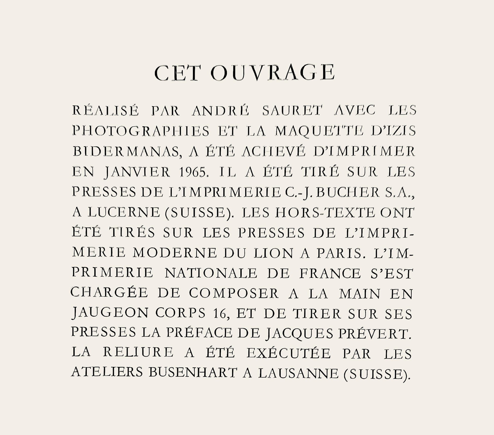Excerpted from the album (translated from French), This album, directed by Andr Sauret, with the photographs and the model of Izis Bidermanas, was completed to print in January, 1965.