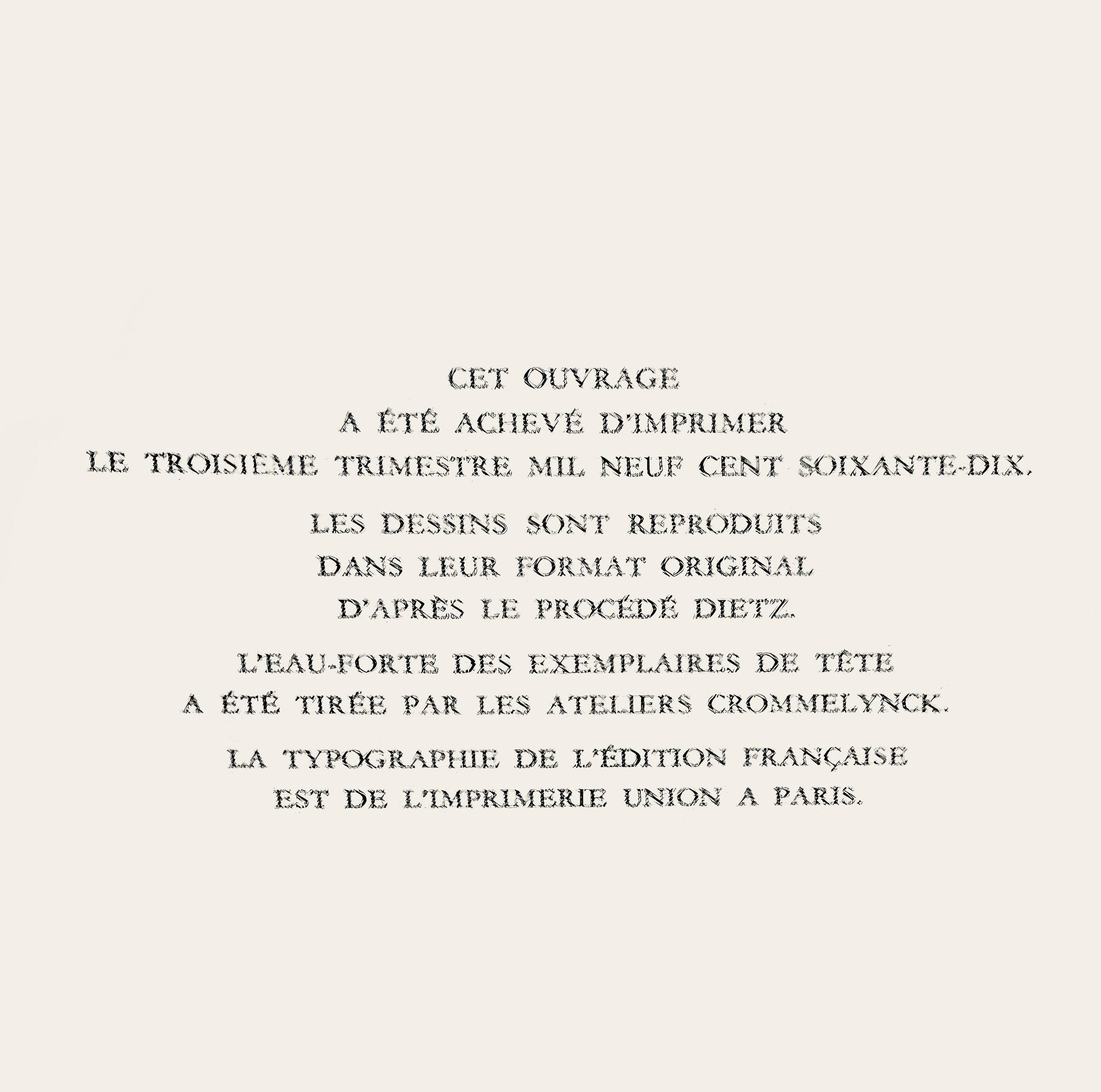 Excerpted from the folio (translated from French), This album has been completed to print, the third quarter, Nineteen Seventy.