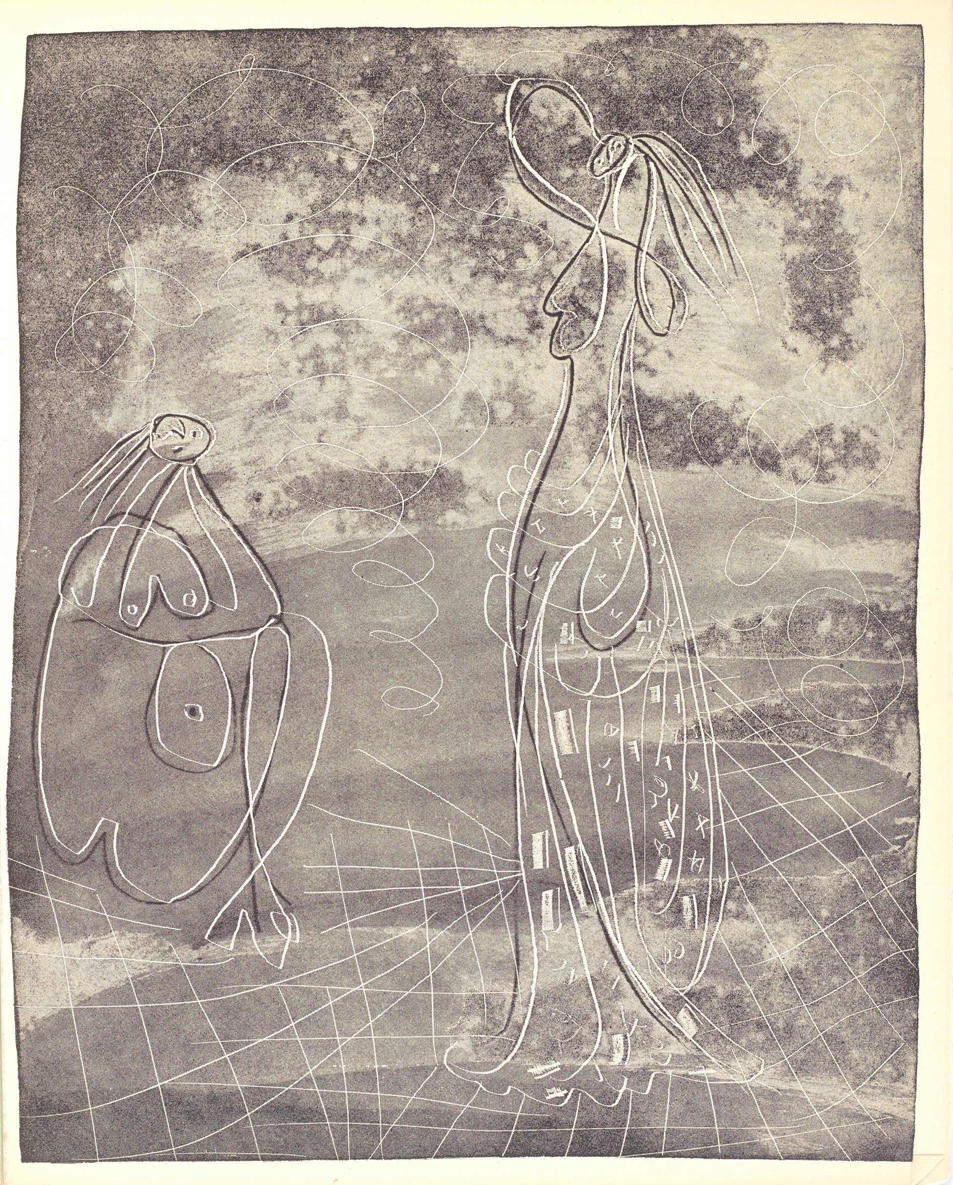 The illustrations have been engraved at the eau-forte by Pablo Picasso so as to be printed in the text by common typographical processes. The eau-forte, intended only for the head examples, is one of the six illustrations drawn in deep cuts on Roger Lacourire's presses.