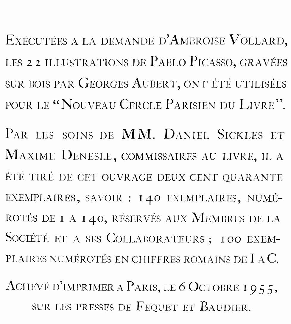 Excerpted from the folio (translated from French), Executed at the request of Ambroise Vollard, the XXII illustrations of Pablo Picasso, engraved on wood by Georges Aubert, were used for the "Nouveau Cercle Parisien du Livre" by MM.