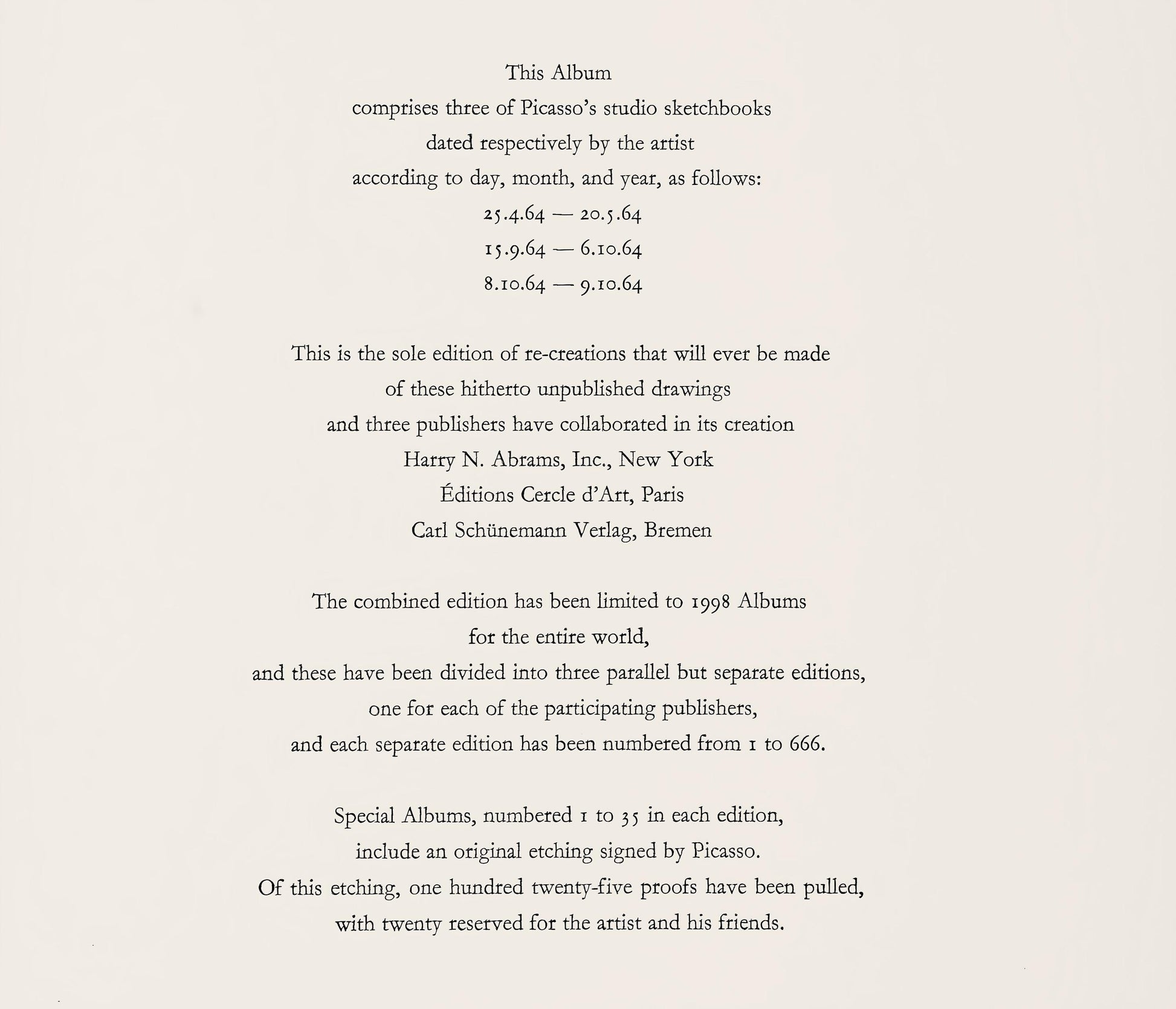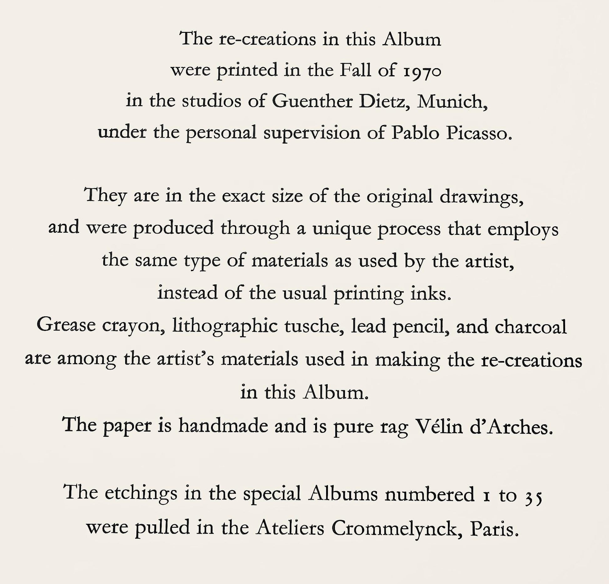 Excerpted from the folio, The re-creations in this Album were printed in the Fall of 1970 in the studios of Guenther Dietz, Munich, under the personal supervision of Pablo Picasso.