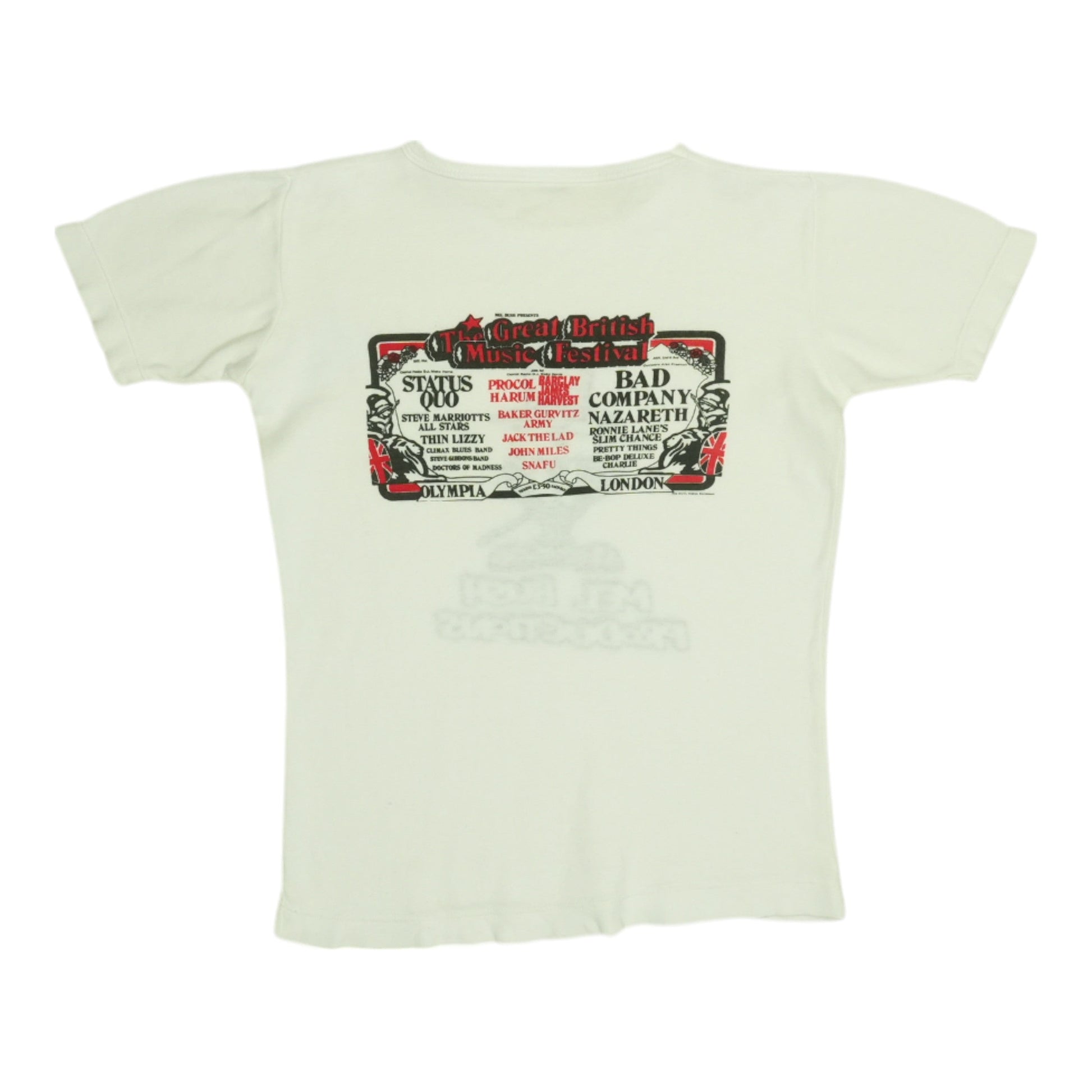 Original vintage 1975 Mel Bush Great British Music Festival Shirt. This is a true vintage shirt, not a modern reproduction. Sizes vary so please use measurements for best idea on fit. Front and back graphics. Shirt is in good condition, no holes, discoloration on front. This shirt will arrive washed and ready to wear.