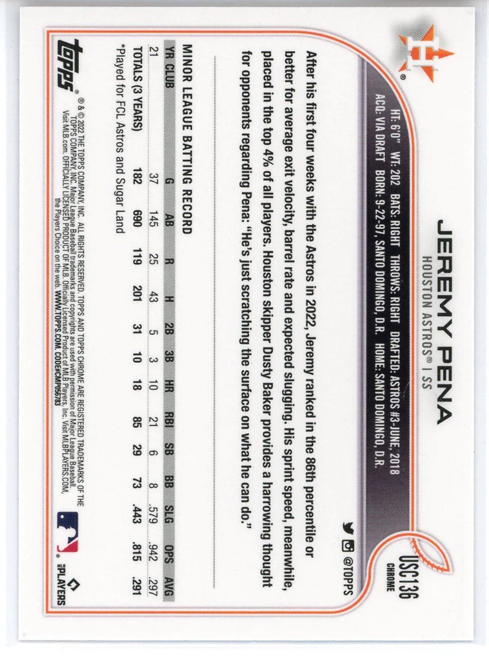 Jeremy Pena 2022 Topps Chrome Rookie Purple Refractor Card #USC136
