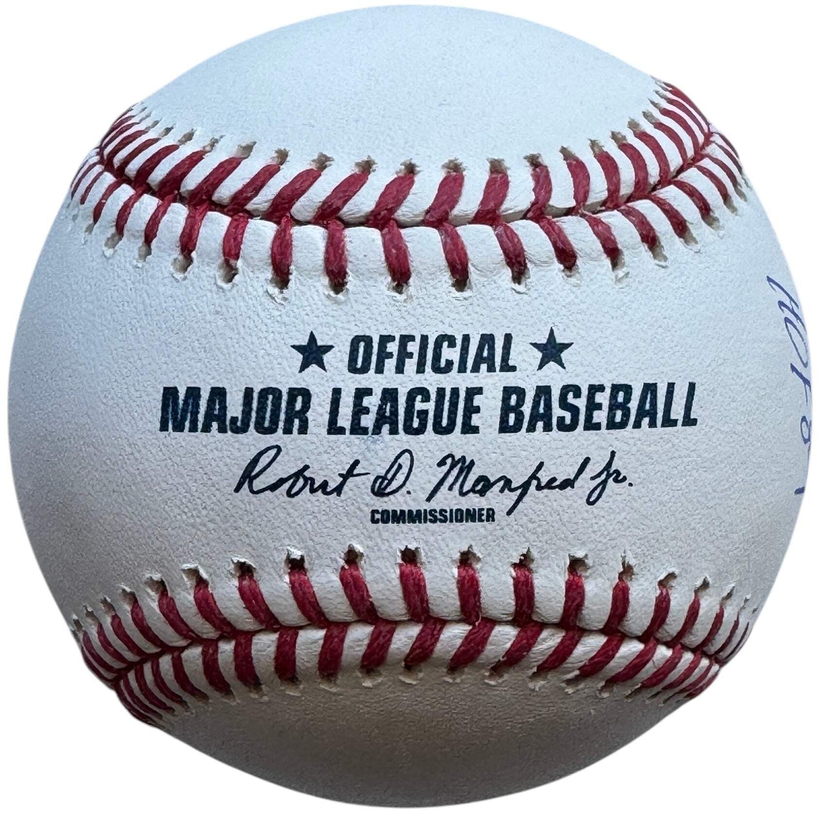Signed in blue on the side panel under HOF Logo on an official Robert Manfred Hall of Fame Baseball