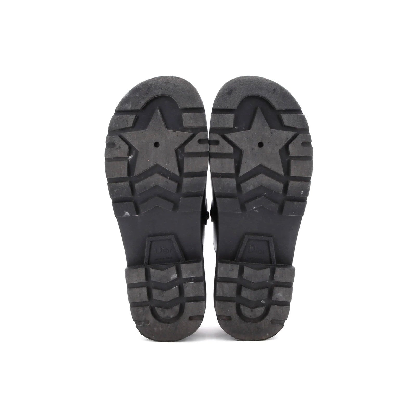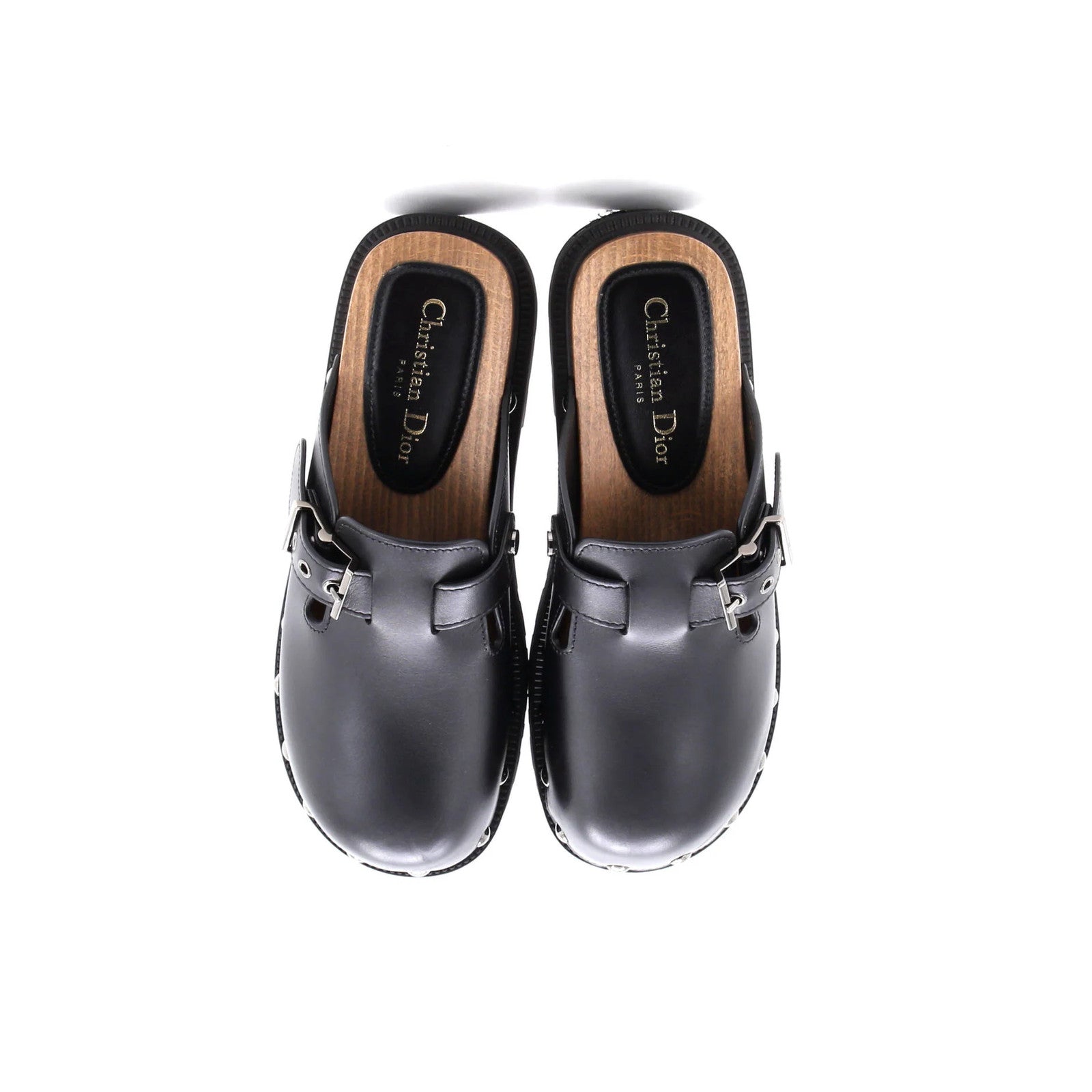 The Dior Women's Diorquake Buckle Clogs are black leather shoes in size US 8 (IT 38), featuring a leather and wood interior. They are in very good condition with signs of wear.