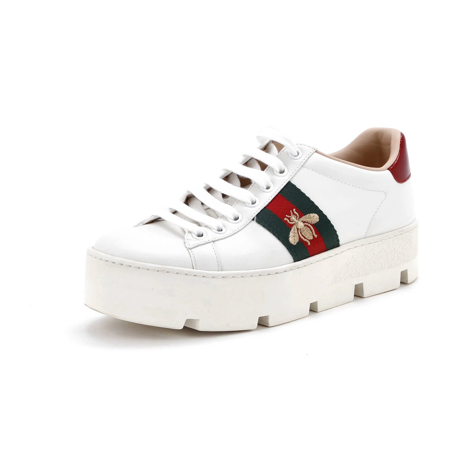 Gucci Women's Leather Ace Web Platform Sneakers in white, size US(W) 6 | IT 36, feature a leather upper with green, red, and white colors, and are in very good condition with some creasing and scuffs.