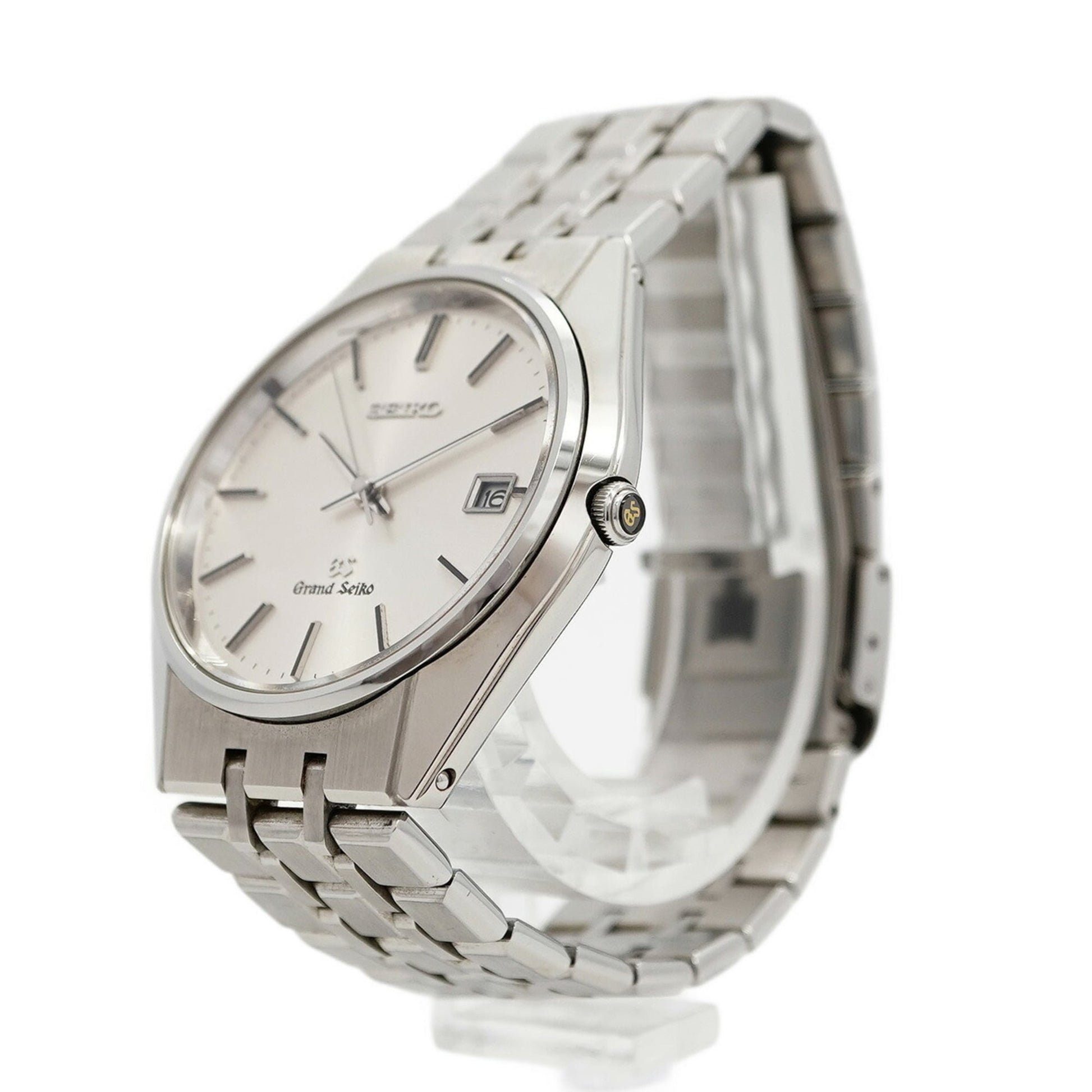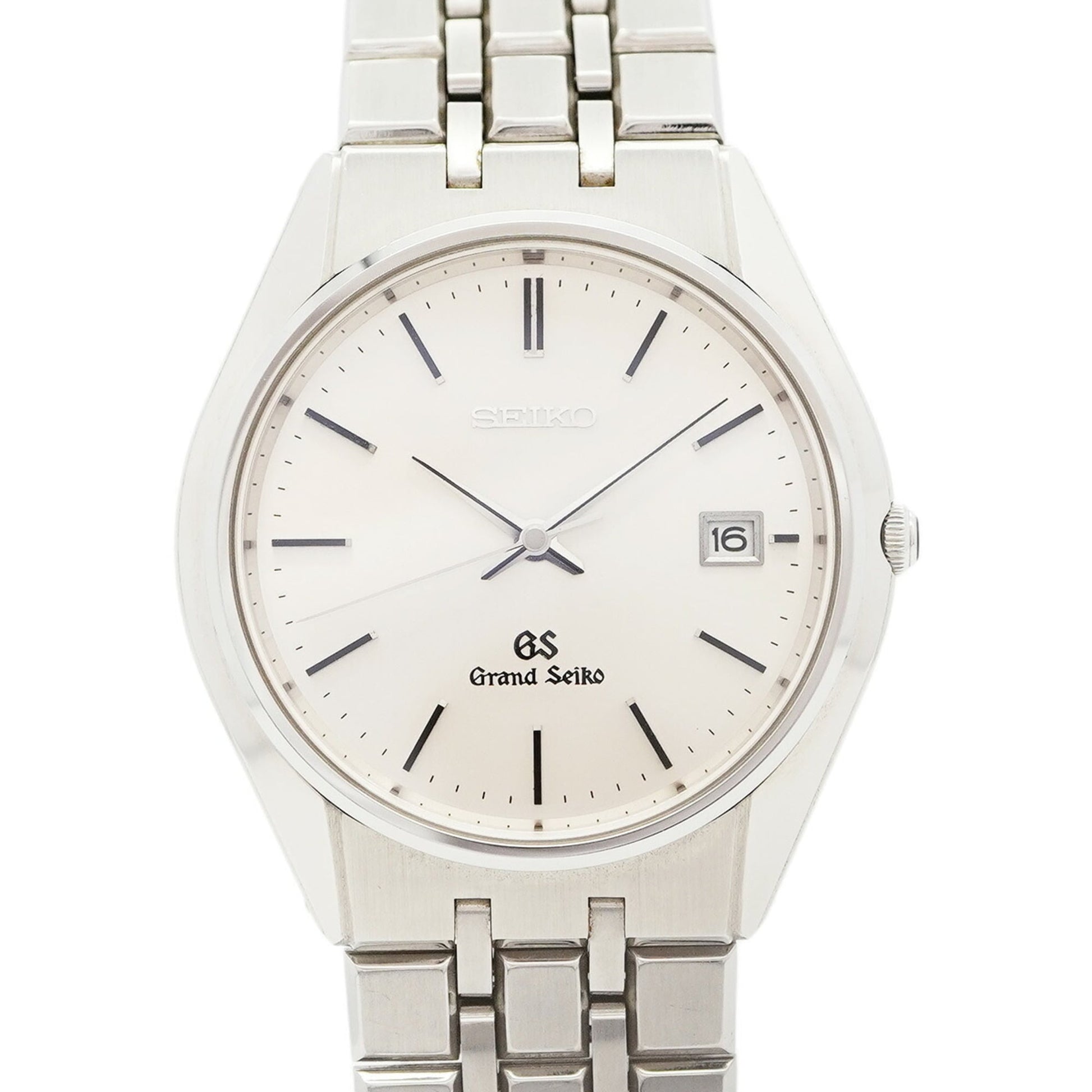 Seiko Grand wristwatch model 9587-8000, features a silver dial, stainless steel band, and a 37mm case diameter, in used but good condition.