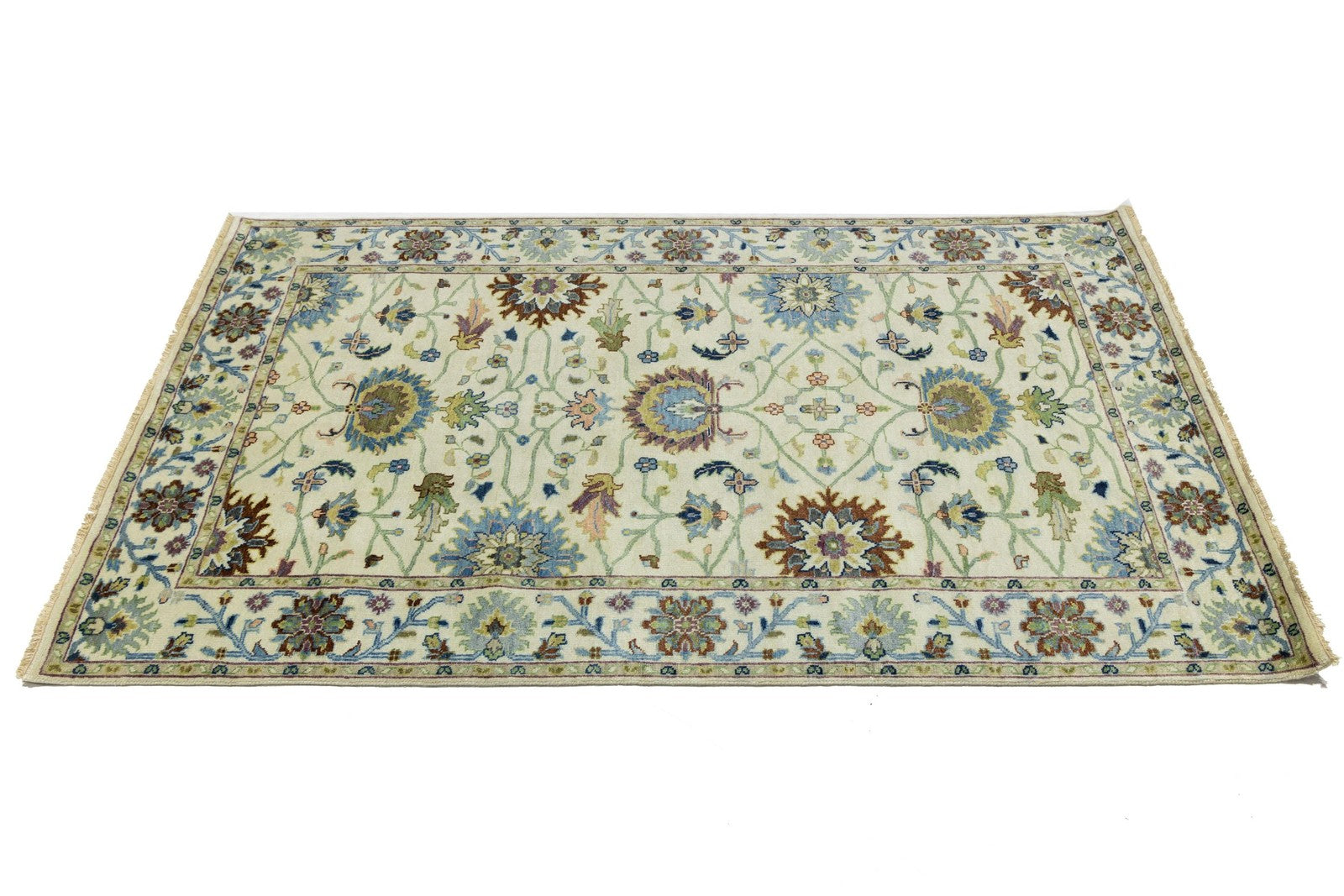 5x8 Ivory Floral Oushak Chobi Hand-Knotted Wool Rug
