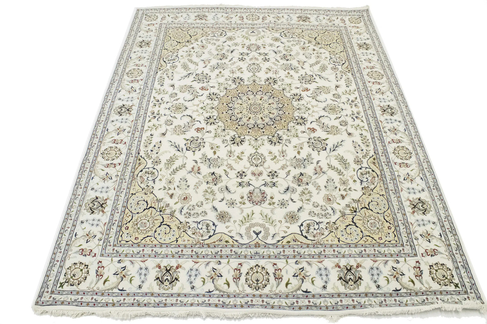 Classic Indo-Nain handmade floral medallion area rug measuring 7'11" x 10'3", made of wool and silk with a hand-knotted weave, featuring a modern design in cream, red, light grey, green, tan, and navy.