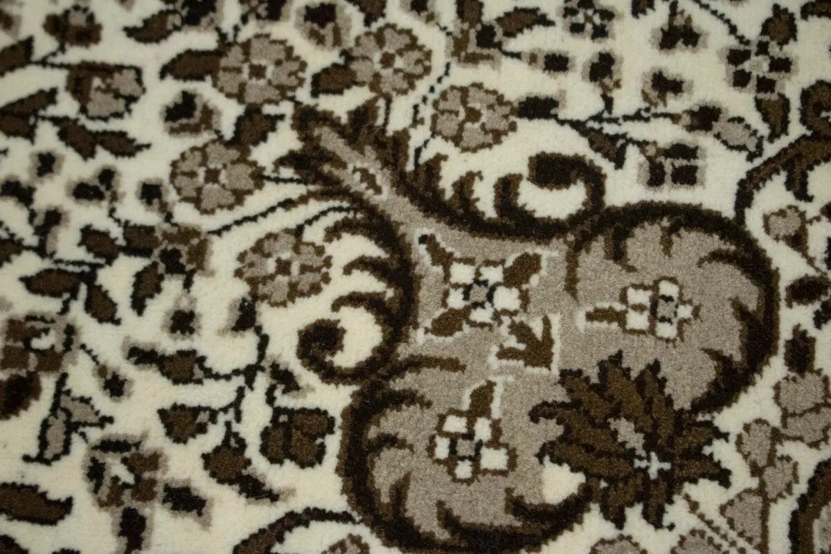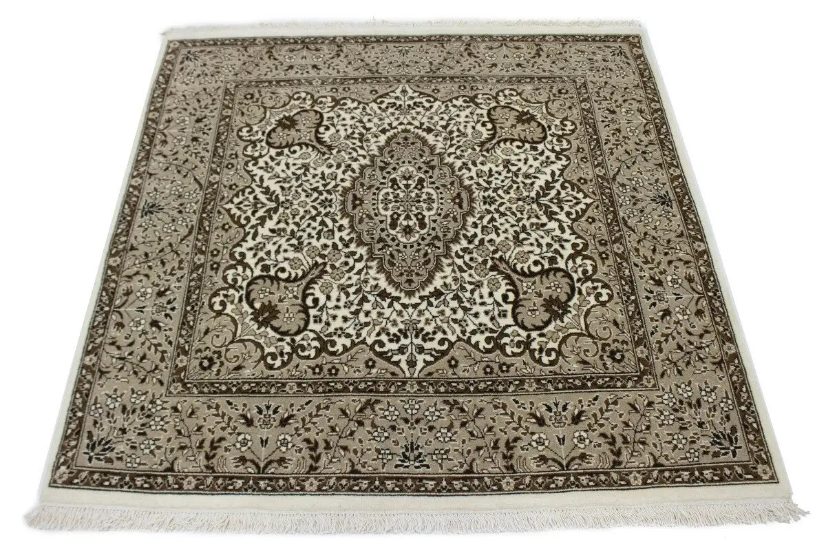 Hand-knotting technique is used in this square 5'x5' wool rug from India, featuring a floral design in cream, brown, and khaki colors. The rug is allergy-friendly, eco-friendly, and highlights a high pile height.