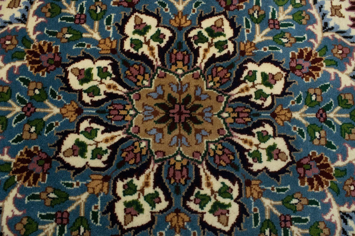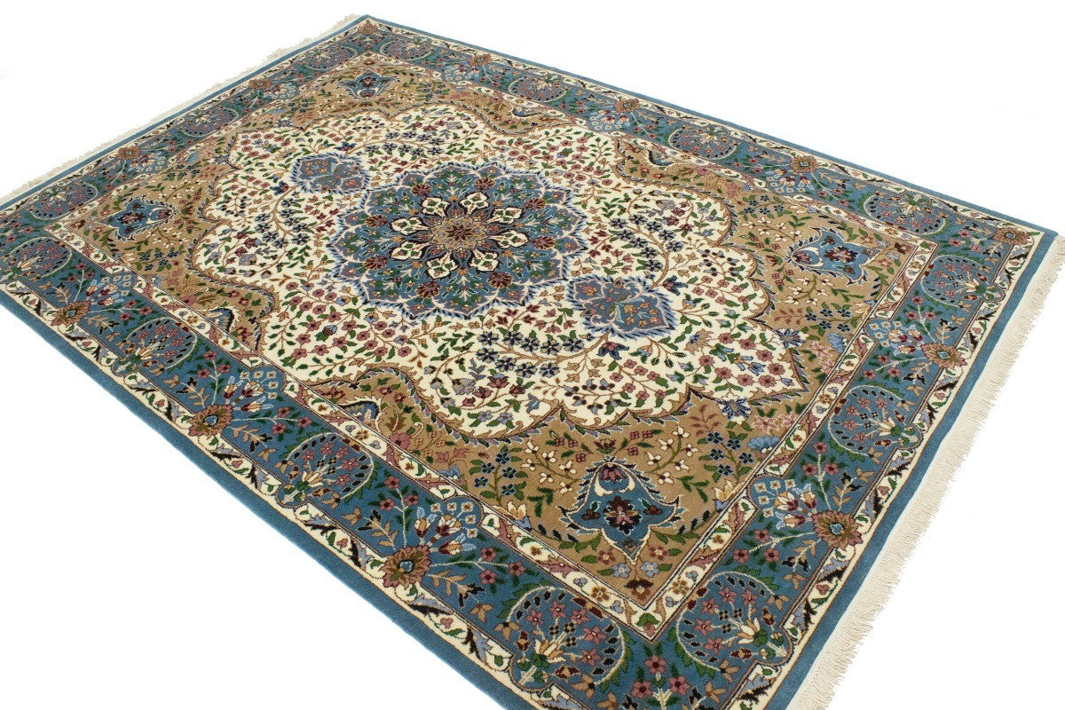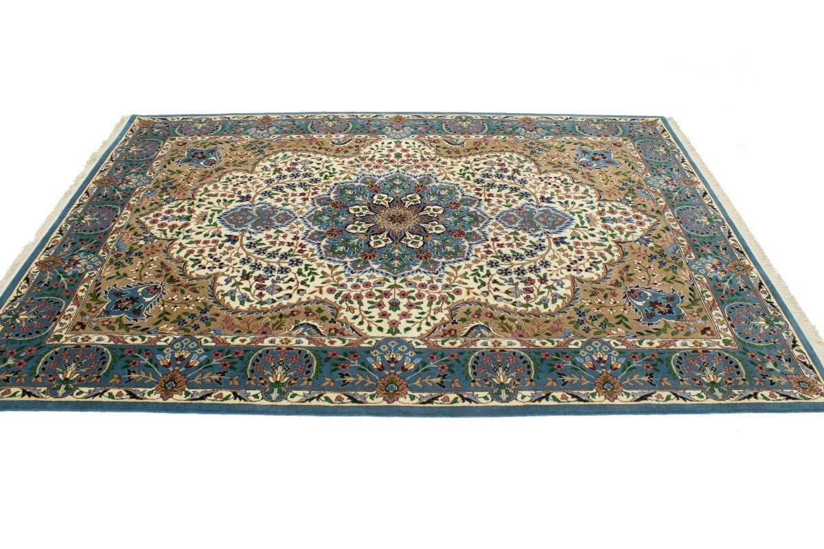 Handmade Classic Floral Kirman Rug, measuring 6'6" x 9'4", features a wool construction with a modern design in cream, teal, blue, tan, rusty pink, and green colors.