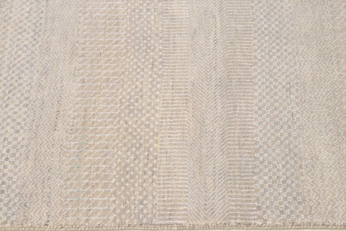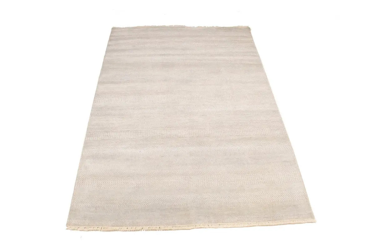 Handmade modern area rug measuring 6'1" x 9'2" in oatmeal color, made from knotted wool, allergy-friendly and eco-friendly properties.