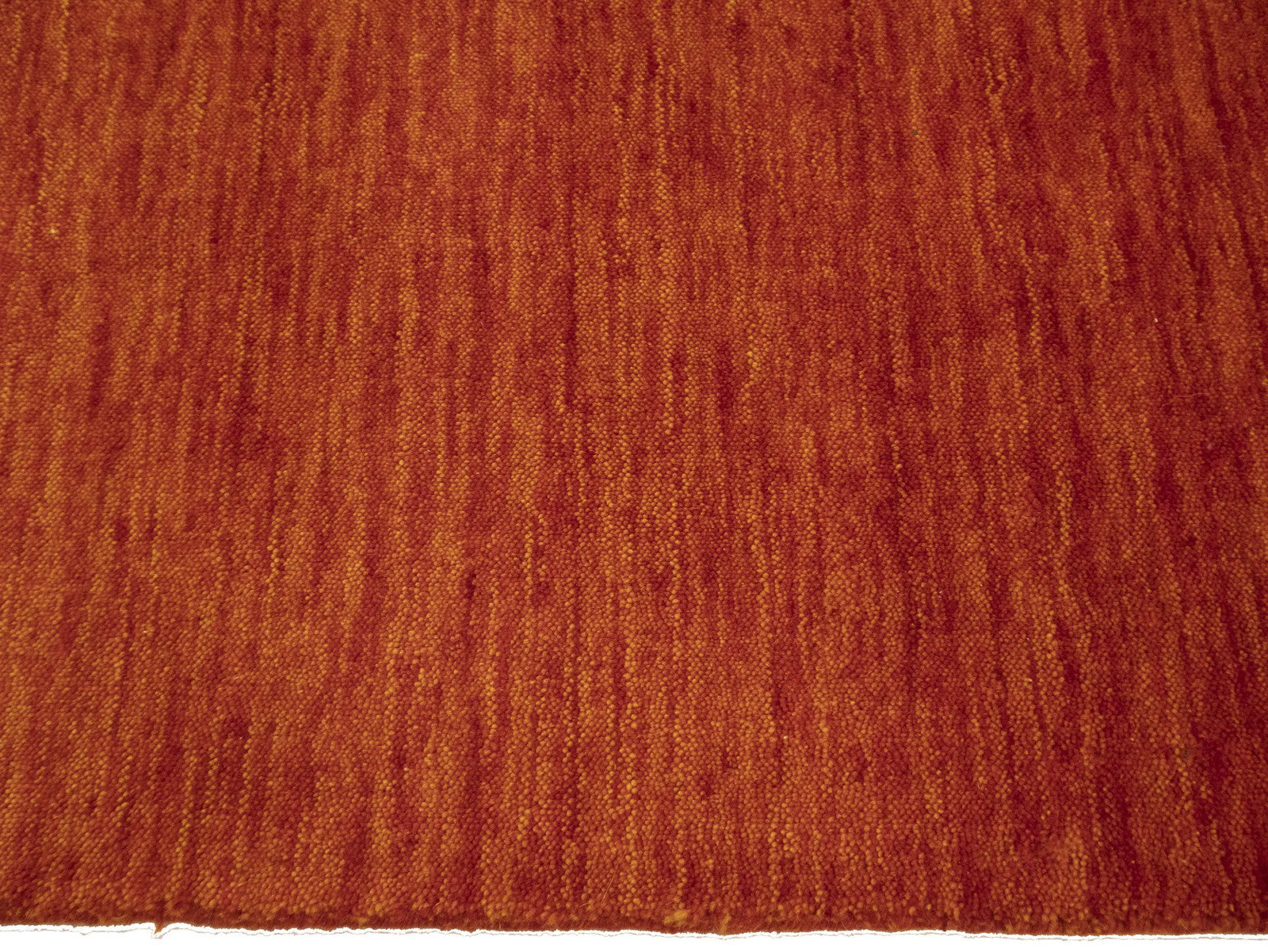 This hand-loomed Gabbeh Tribal Wool Carpet measures 9'0 x 11'11, features a pictorial theme in orange-red, and is designed for allergy-friendliness and easy cleaning.