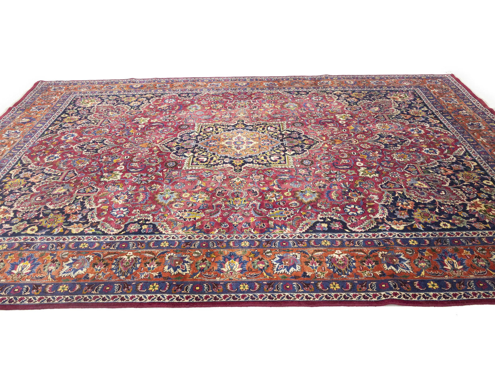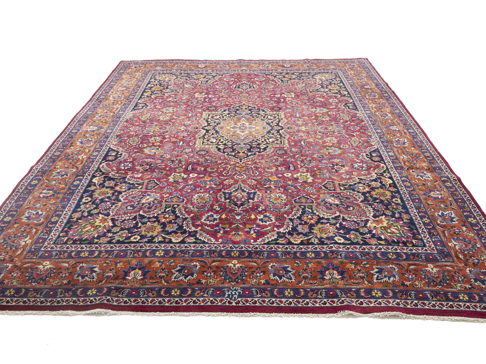Hand-knotted vintage floral wool area rug measuring 9'7" x 12'10", featuring a variety of colors and a thickness of 0.25 inches, allergy friendly and eco-friendly.