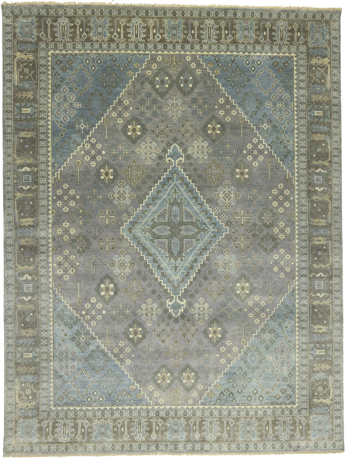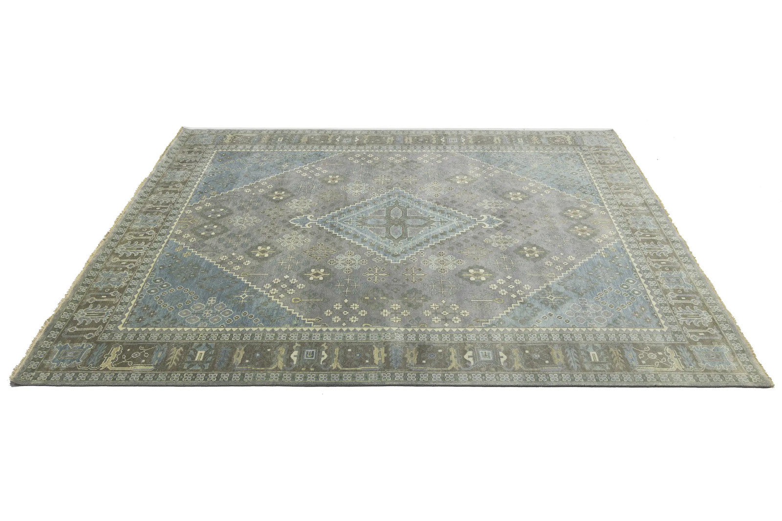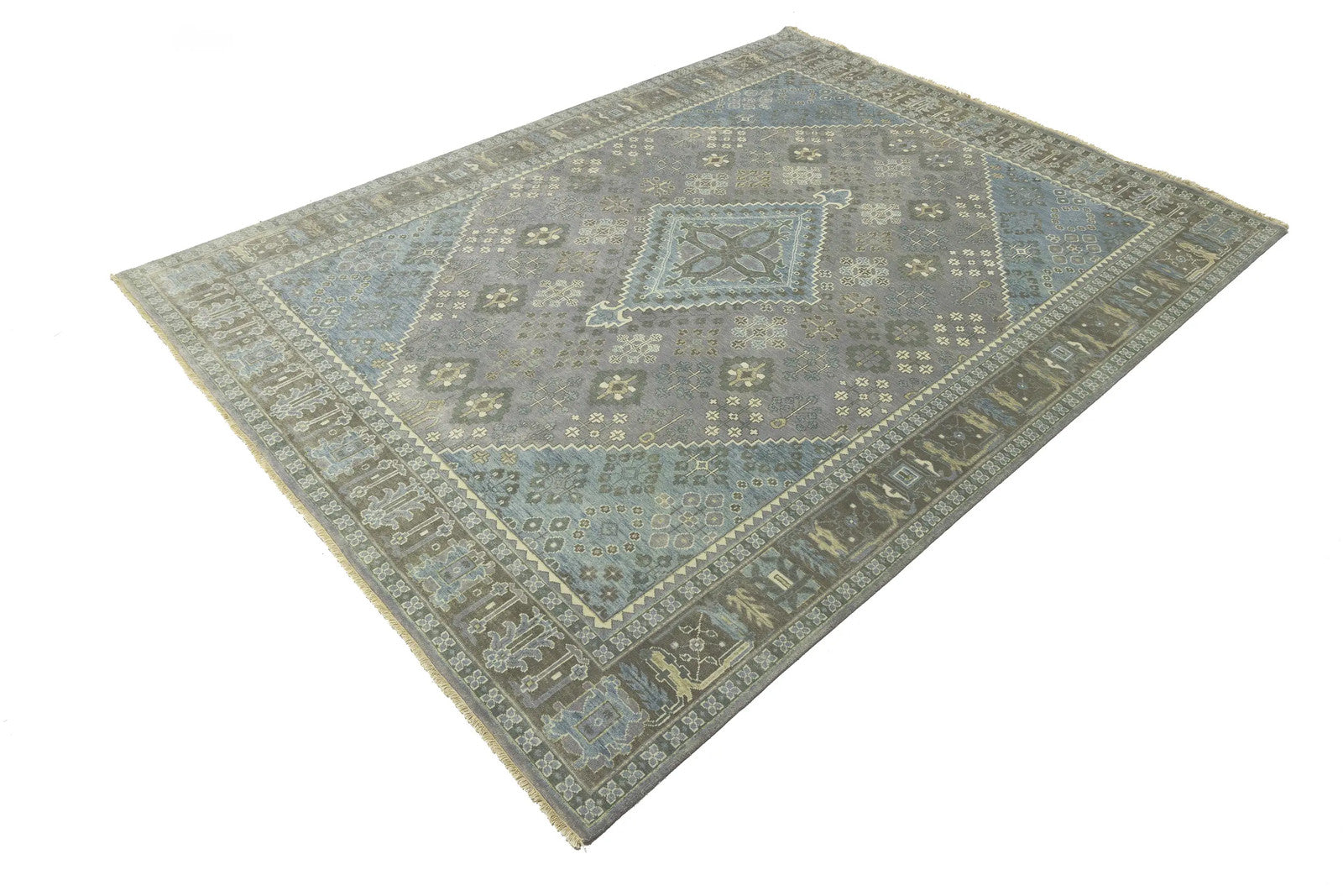 Handmade 9x12 ft Tribal Geometric Oriental Rug from India, crafted from wool with muted colors and a hand-knotted weave.