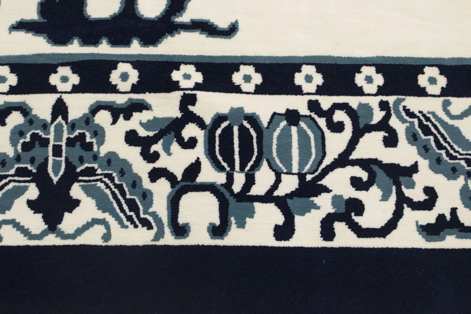 Handmade oversized oriental rug from India, floral design in ivory and navy blue, measuring 12' x 15', with a thick pile and multiple eco-friendly features.