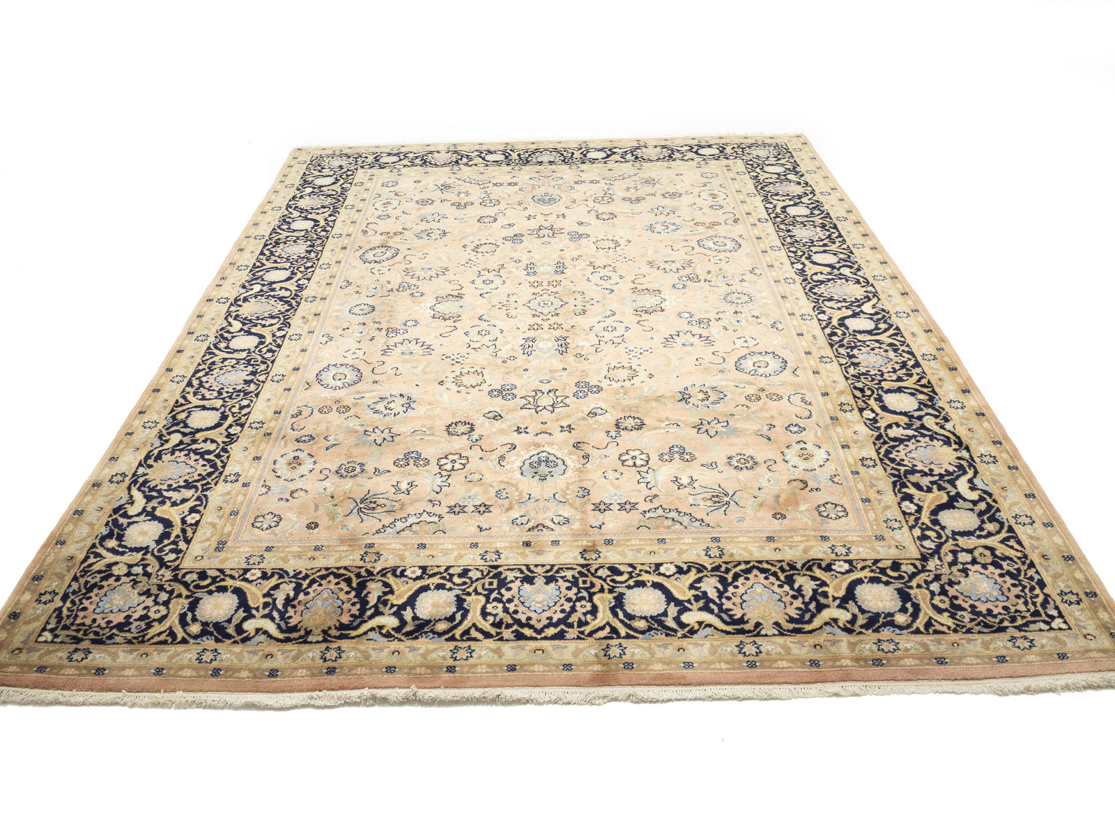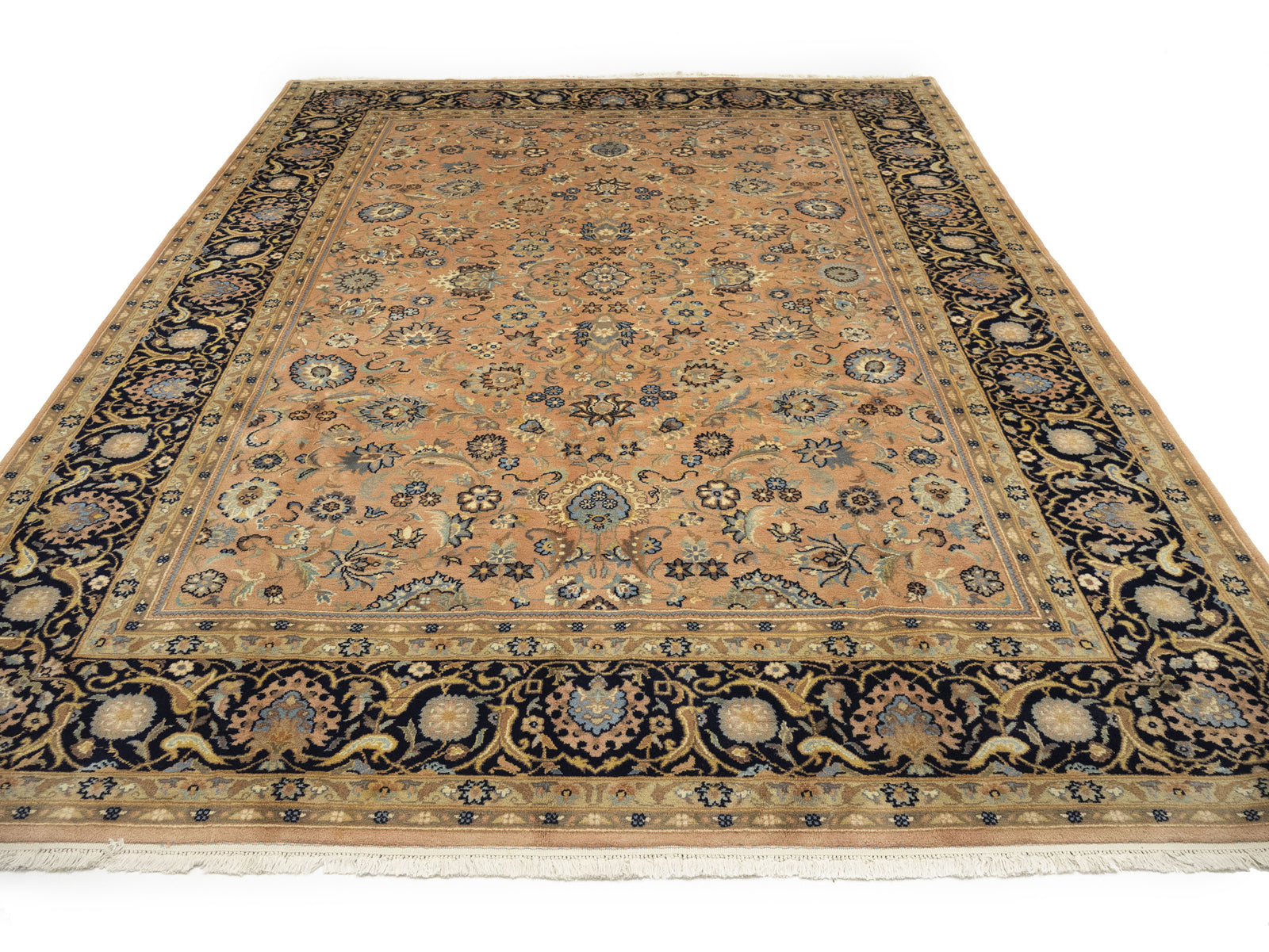 This Traditional Floral Hand-Knotted Oriental Rug measures 9'0" x 12'3" and features a vintage design in light salmon, dark purple-navy, cream, beige, and light blue. Made in India from wool, it has a medium pile height and offers various benefits including being allergy friendly, eco friendly, and kid friendly.