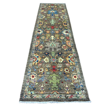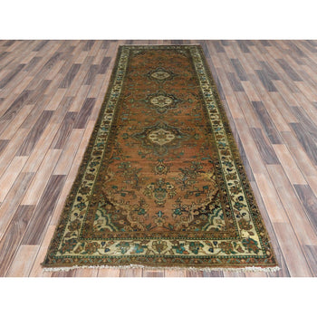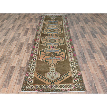 3'2"X11'8" Brown Peshawar Heris Design Pure Wool Hand Knotted Runner Rug