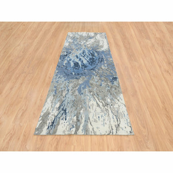 4'2"X11'9" Blue Modern Design Wool And Silk Hand Knotted Wide Runner Rug