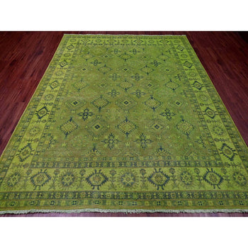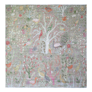 8'X8' Swamp Green Hand Knotted Peshawar Birds Design Soft Wool Square Rug