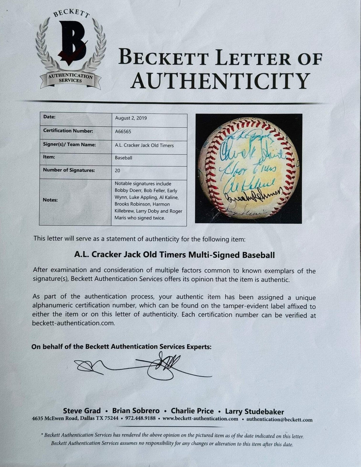 This A.L. Cracker Jack Old Timers Autographed Baseball includes 20 signatures and is authenticated by Beckett, featuring a Rawlings National Old Timers Classic baseball.
