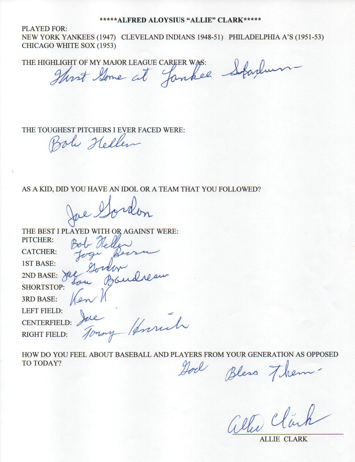 Allie Clark autographed survey page, signed in blue pen, with authentication by James Spence Authentication (JSA), certificate #II15735.