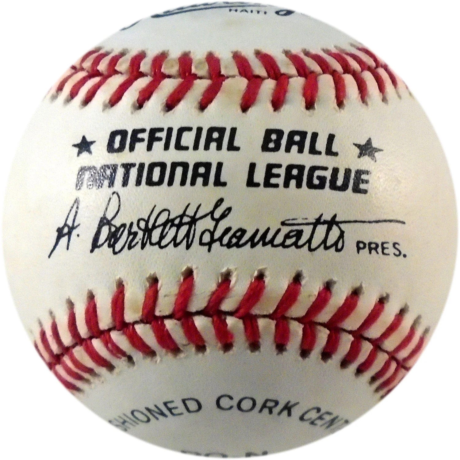 Signed in blue pen across the sweet spot of an official National League Bartlett Giamatti baseball