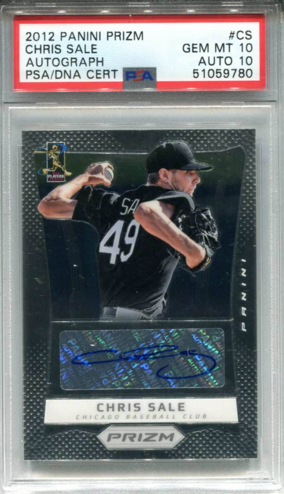 Chris Sale autographed 2012 Panini Prizm card, graded Gem Mint 10 by PSA, with the signature in blue sharpie. The card represents a high-quality collectible for sports memorabilia enthusiasts.