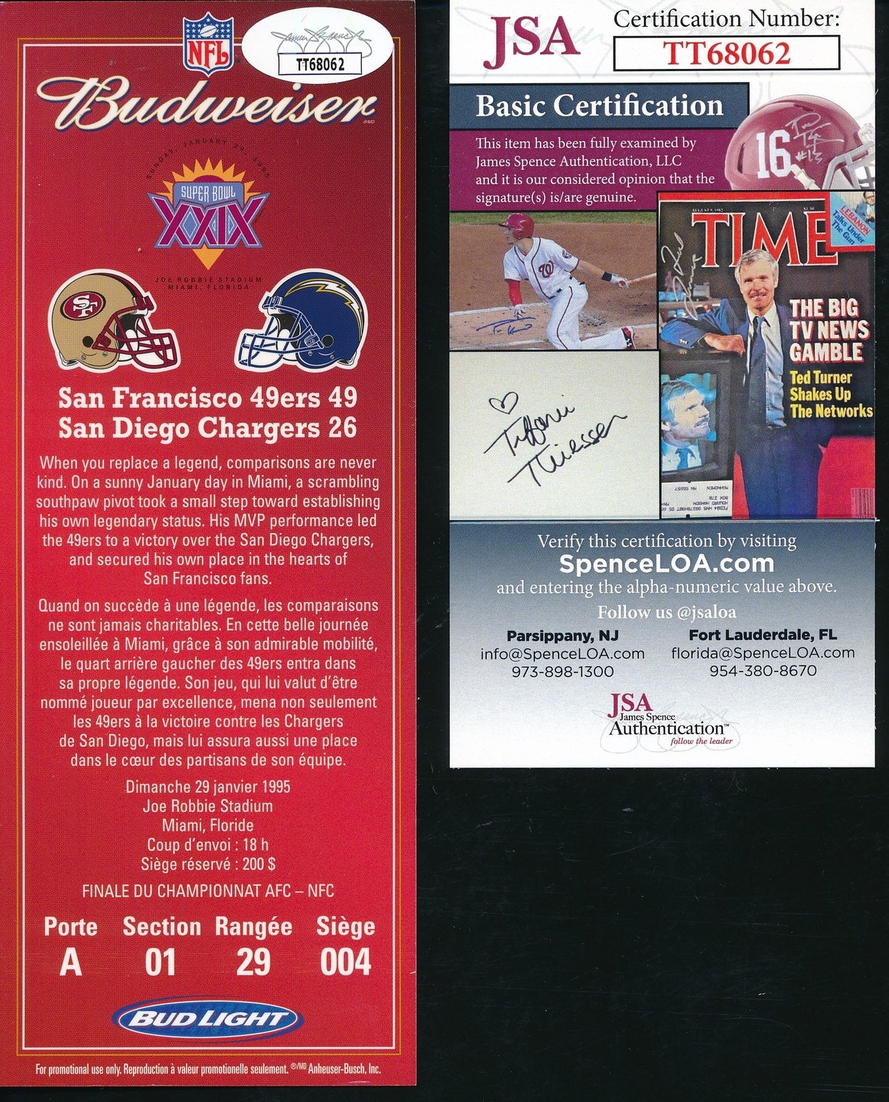 This original Super Bowl XXIX replica full ticket, signed by Jerry Rice, is authenticated by JSA. It represents a significant collectible for football fans.