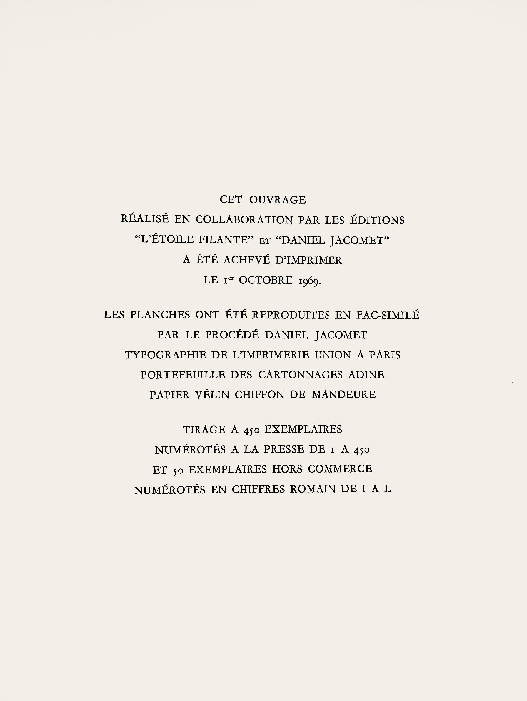 Excerpted from the folio (translated from French), This folio, produced in collaboration by les ditions "L'toile Pilante" and "Daniel Jacomet", has been completed to print, October 1, 1969.