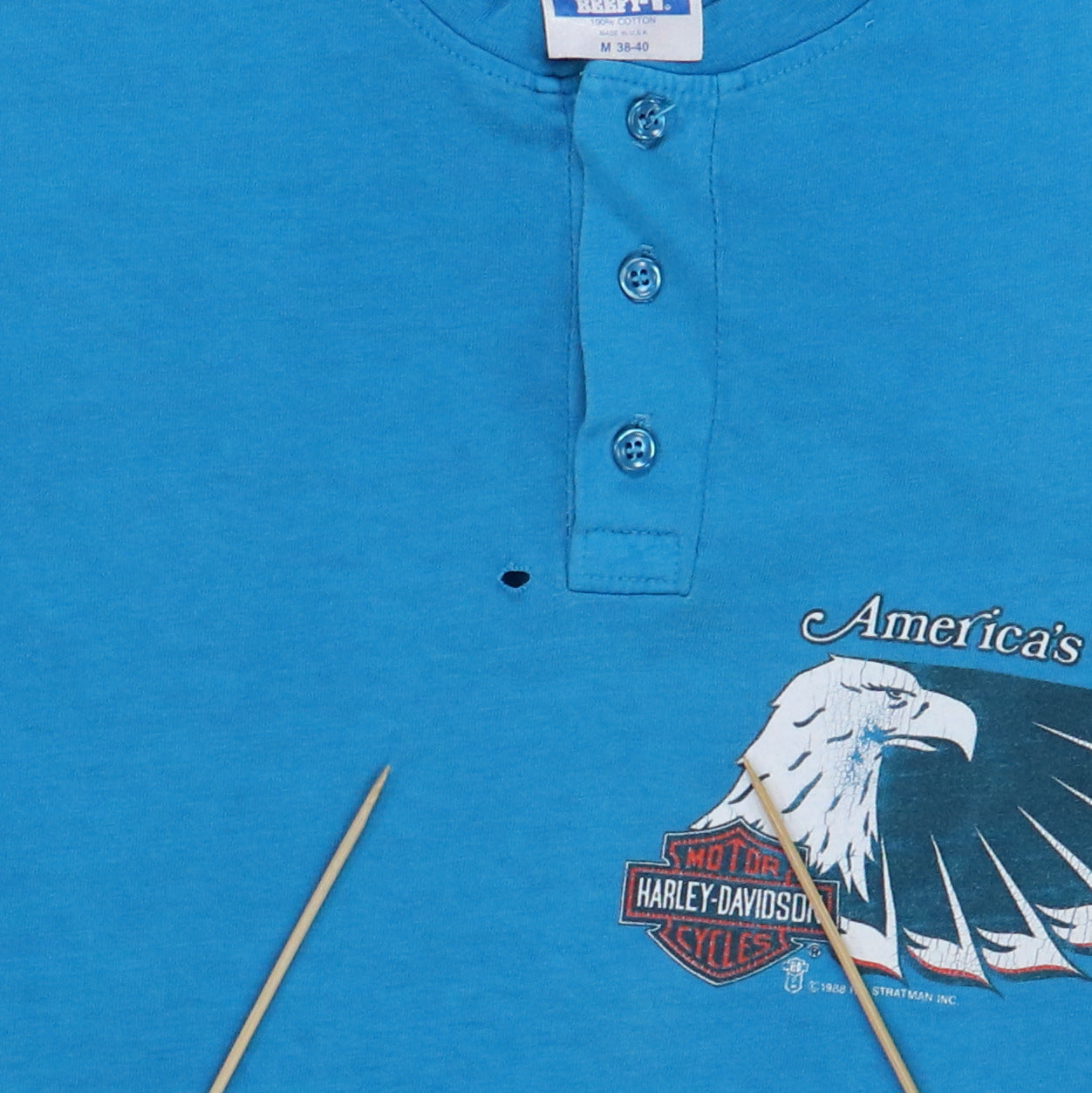 Original vintage 1988 Harley Davidson Motor Cycles Springfield Shirt. This is a true vintage shirt, not a modern reproduction. Sizes vary so please use measurements for best idea on fit. Front and back graphics. Shirt is in worn condition, holes throughout, discoloration throughout. This shirt will arrive washed and ready to wear.