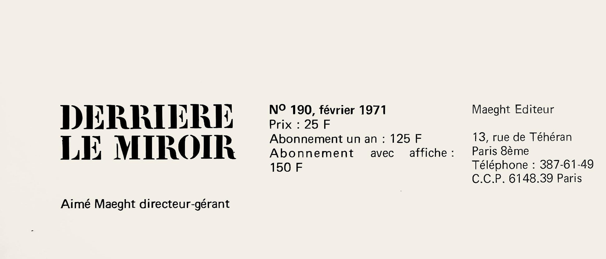 Aim Maeght, initiator of Derrire le Miroir, had already made few attempts to start publications illustrated with fine printed lithographs in colours in the years prior to the launch of Derrire le Miroir.