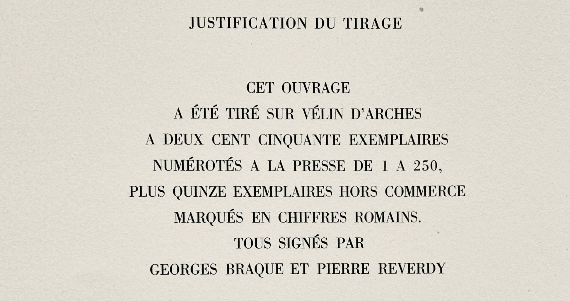 Justification of the draw this book was shot on vlin d'Arches, CCL examples, numbered to the press from I to CCL, more than fifteen non-trade examples marked in roman numerals. All [album colophons] signed by Georges Braque and Pierre Reverdy.
