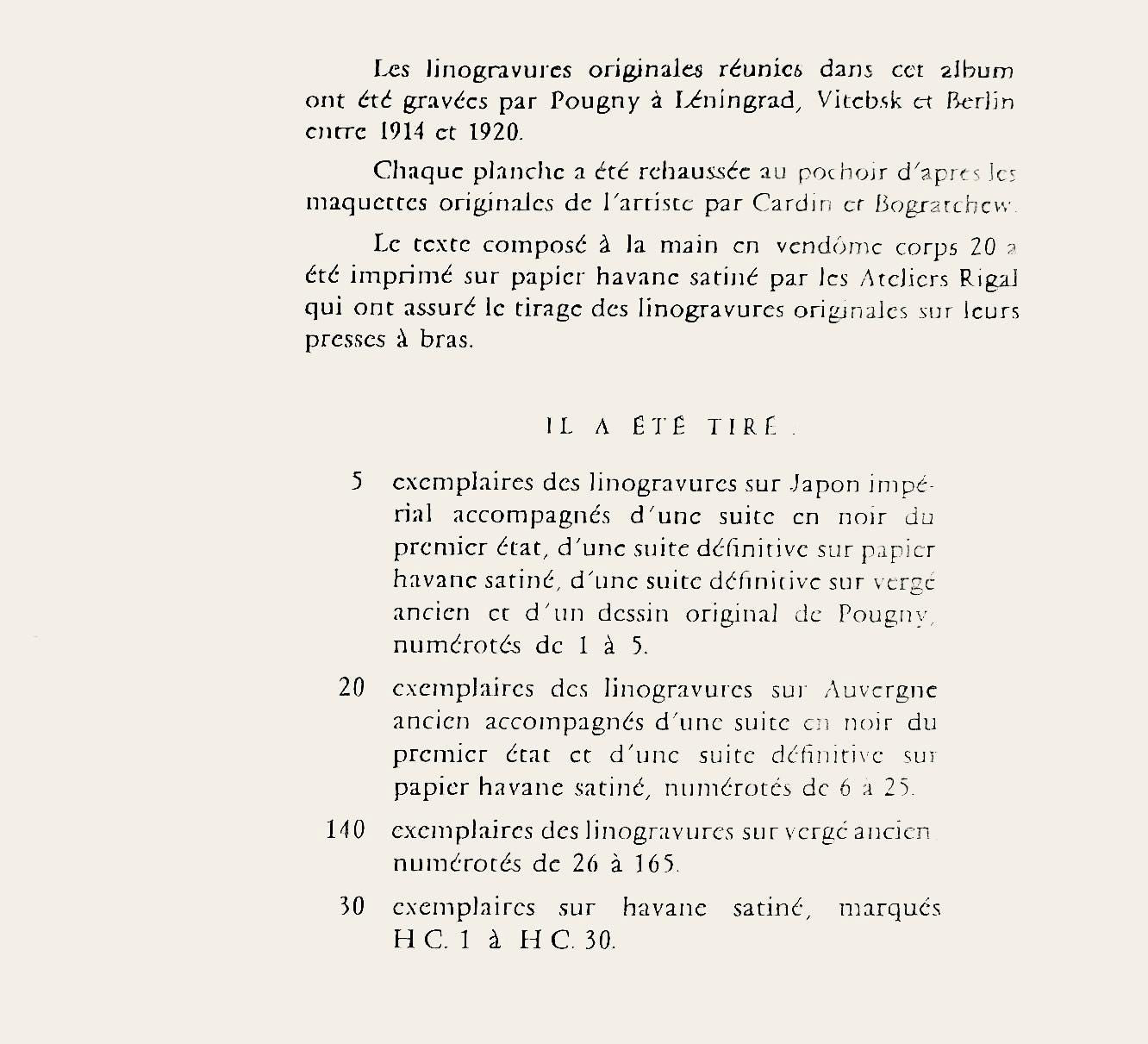 It has been shot: 5 examples of the linocuts on Japon imprial accompanied by a black suite of the first state, a definitive suite on papier havane satin, a definitive suite on verg ancien, and an original drawing by Pougny, numbered from 1 to 5; 20 examples of the linocuts on Auvergne ancien accompanied by a black suite of the first state, and a final suite on papier havane satin, numbered from 6 to 25.