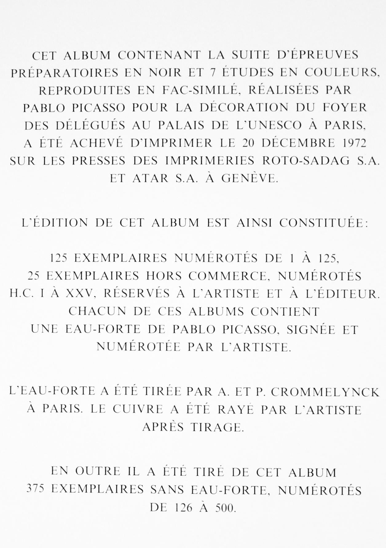 Excerpted from the folio (translated from French), This album contains the series of tests, preparatory in black and VII color studies, reproduced, made by Pablo Picasso for the decoration of the delegates' home at the UNESCO palace in Paris.