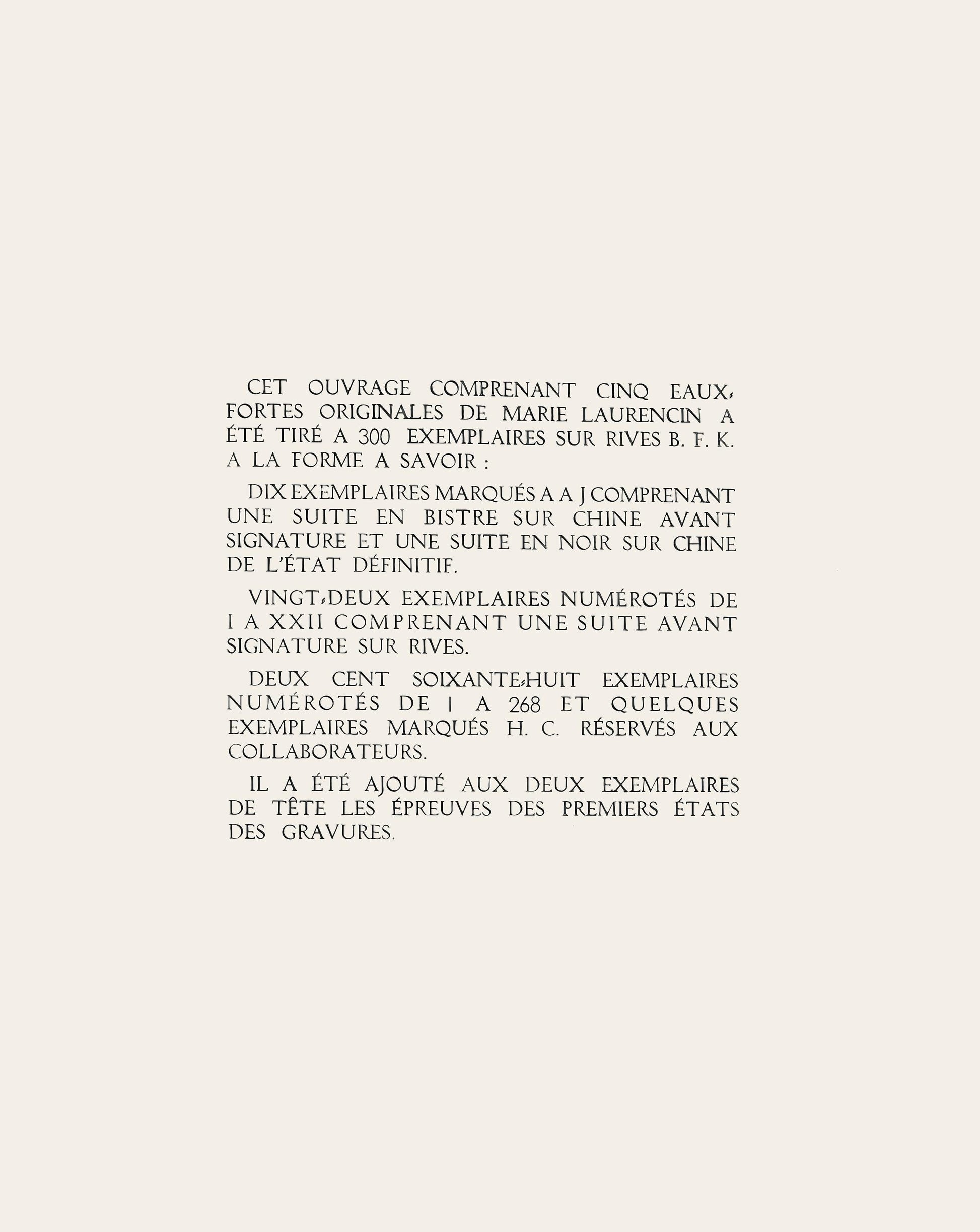 The boards were engraved, copperplate, by Marie Laurencin and printed on the presses of the Ateliers d'art Paul Haasen, in Paris.
