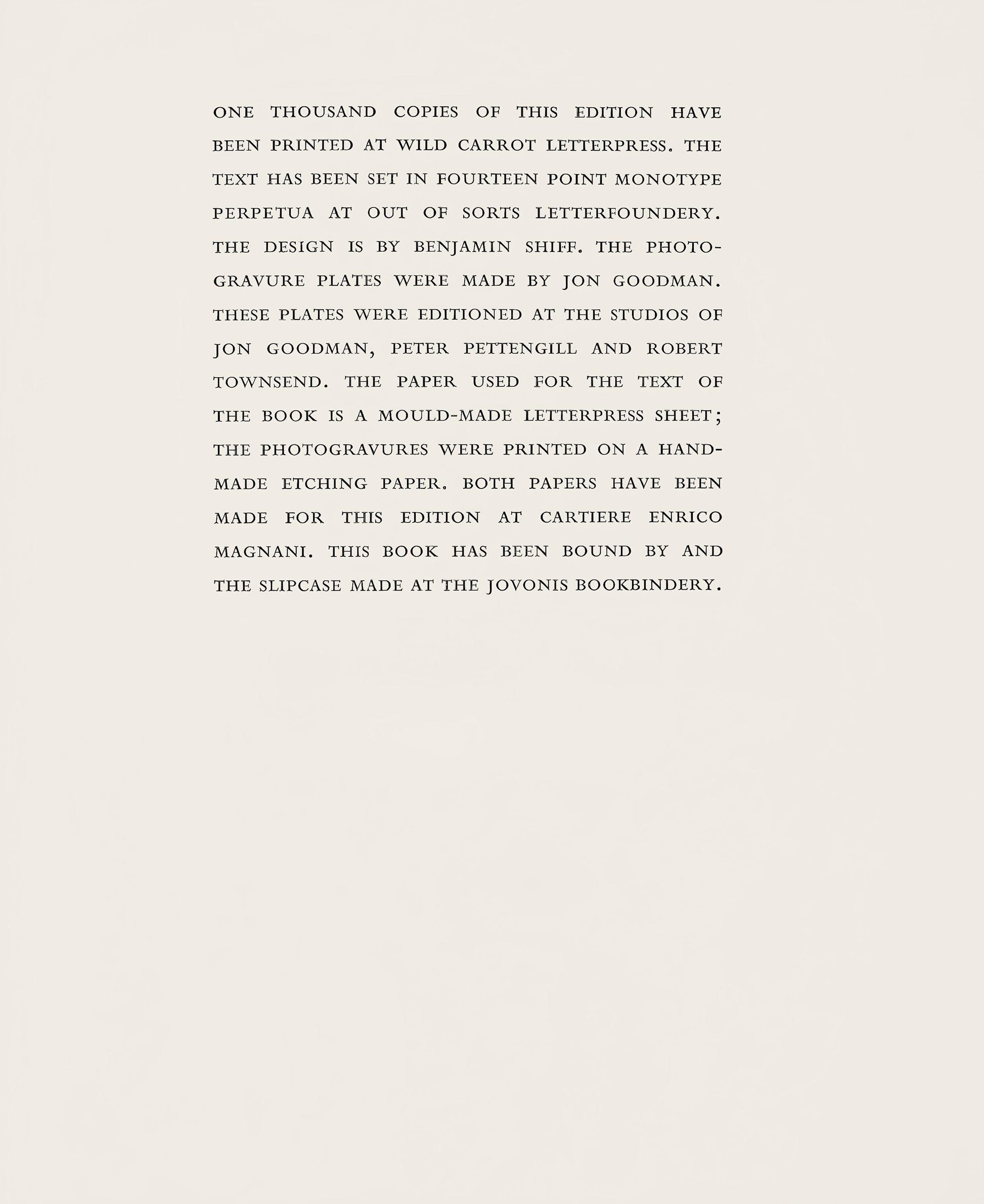 The paper used for the text of the book is a mould-made letterpress sheet; The photogravures were printed on a handmade etching paper.