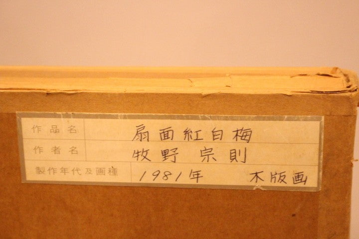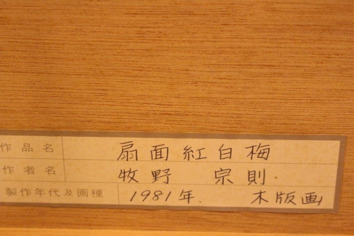 Munenori Makino Woodblock Print "Red And White Plum Blossoms" 1981 Fan Shape