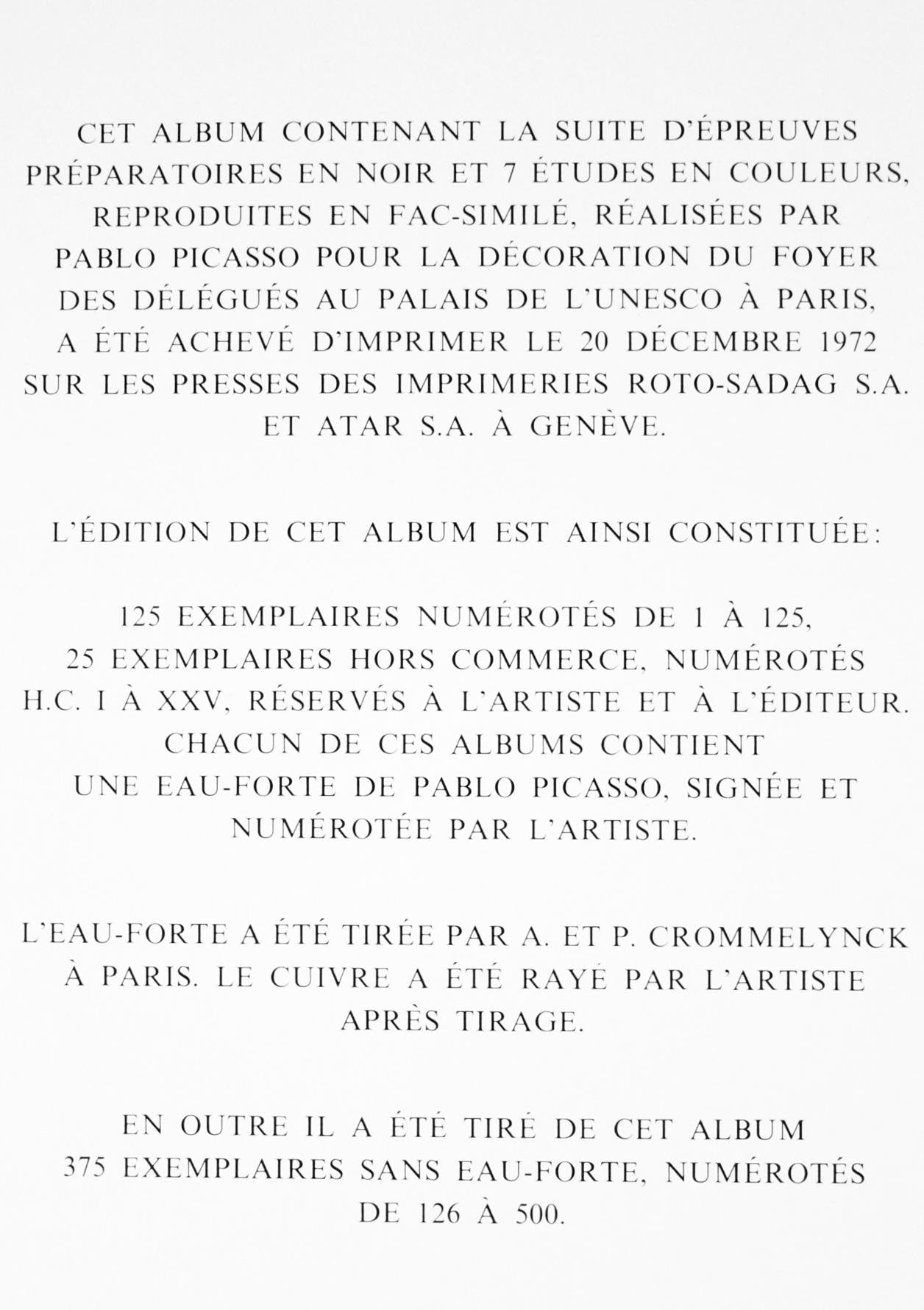 Excerpted from the folio (translated from French), This album contains the series of tests, preparatory in black and VII color studies, reproduced, made by Pablo Picasso for the decoration of the delegates' home at the UNESCO palace in Paris.
